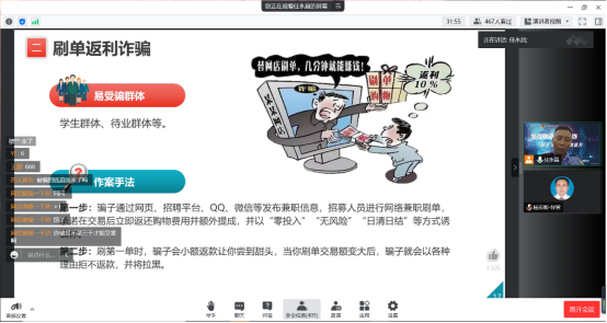 2022年9月2日,成都市因疫情静默的第一天晚上,beats365联合九里堤派出所民警为本科、研究生新生开展了一场线上防电信诈骗主题讲座。本次讲座邀请到了九里堤派出所具有多年防诈经验的民警赵小磊主讲,beats365党委副书记杨宏毅、本科2022级辅导员薄慧、陈诗溢,研究生2022级辅导员卢婧茹、任永昌出席讲座。
