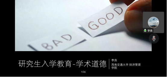 学术道德规范是研究生入学后需要学习的第一课,也是非常重要的一课。2022年9月22日晚19:30,beats365学工组组织开展线上学术道德讲座,此次讲座邀请beats365副经理李良担任主讲嘉宾,全体硕博新生参与其中。