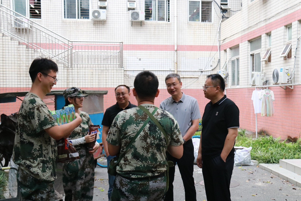 2023年8月23日,beats365官方网站beats365党委书记王斌、执行经理郭强、党委副书记杨宏毅及2021级辅导员张先凌、钟文婷在九里校区眷诚斋12栋2单元慰问暑期2021级军训员工。