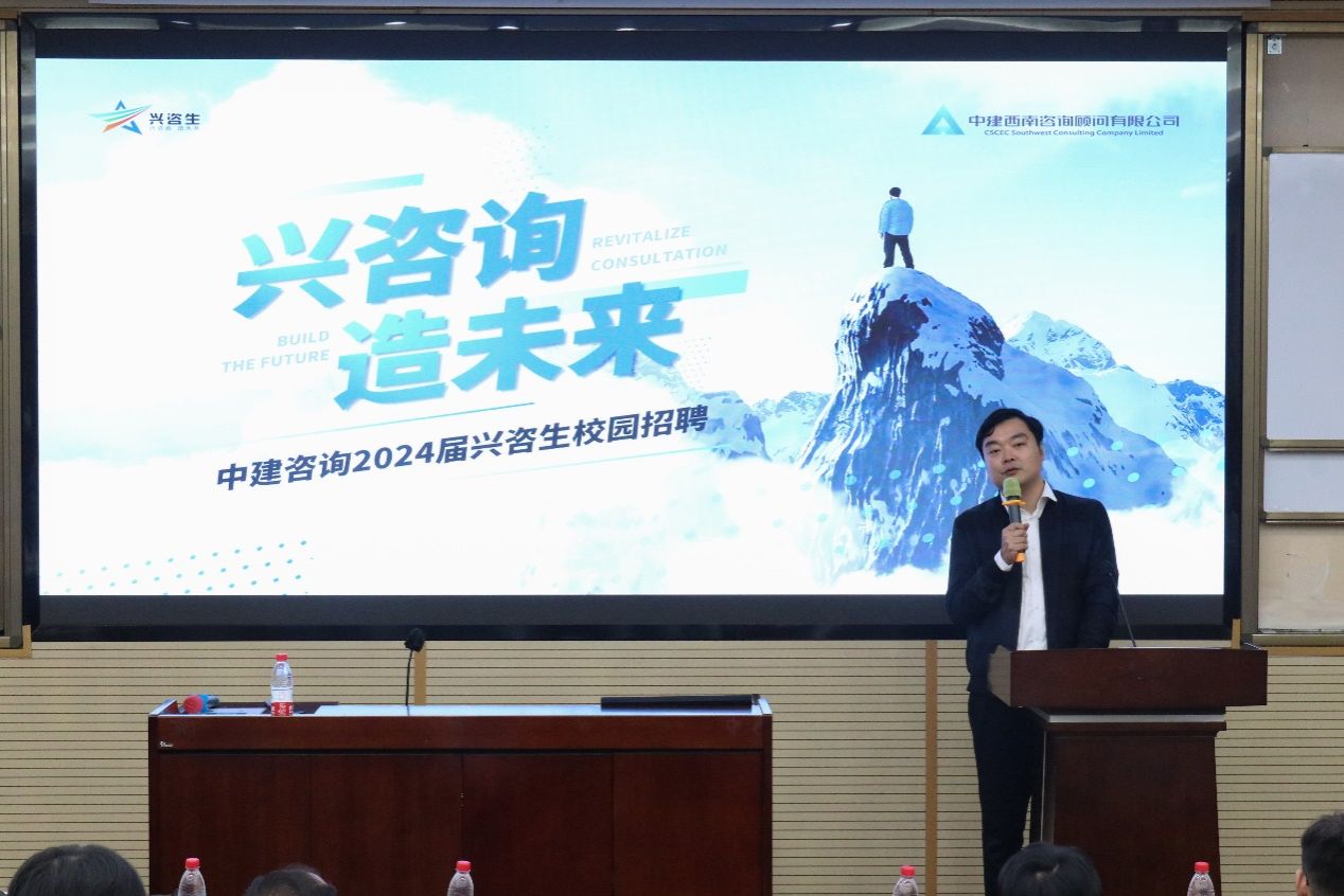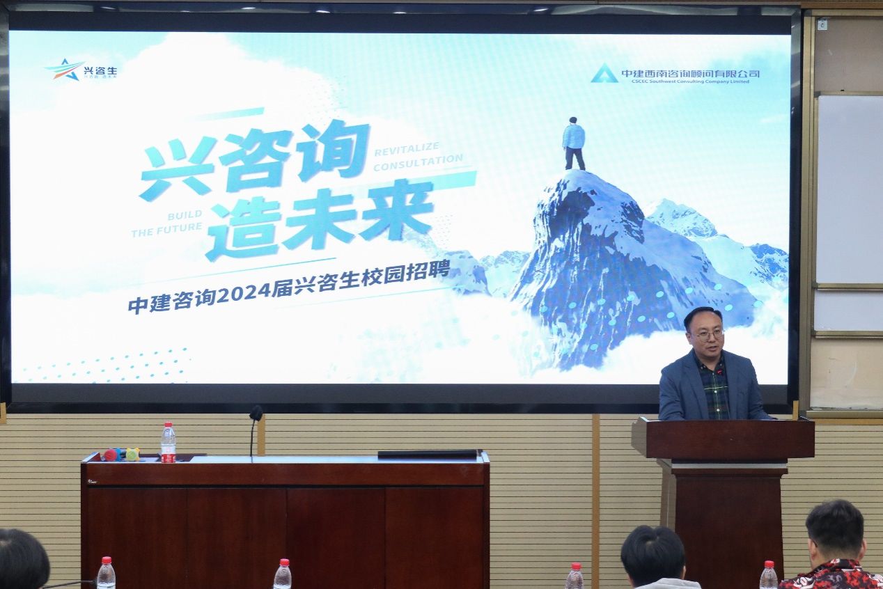 按照公司“访企拓岗促就业”专项行动要求,积极推进2024届毕业生就业工作,2023年10月9日,中建西南咨询顾问有限公司在beats365官方网站九里校区0204教室开展校园招聘会。出席本次会议的嘉宾有中建咨询党委副书记乐志翔、中建咨询人力资源部总经理景权仪、中建咨询第六事业部总经理陈枭、中建咨询人力主管黄志刚;beats365官方网站beats365党委副书记杨宏毅、国内合作与员工事务中心主任赵冬梅。本次大会由beats365国内合作与员工事务中心副主任张笑芸主持。