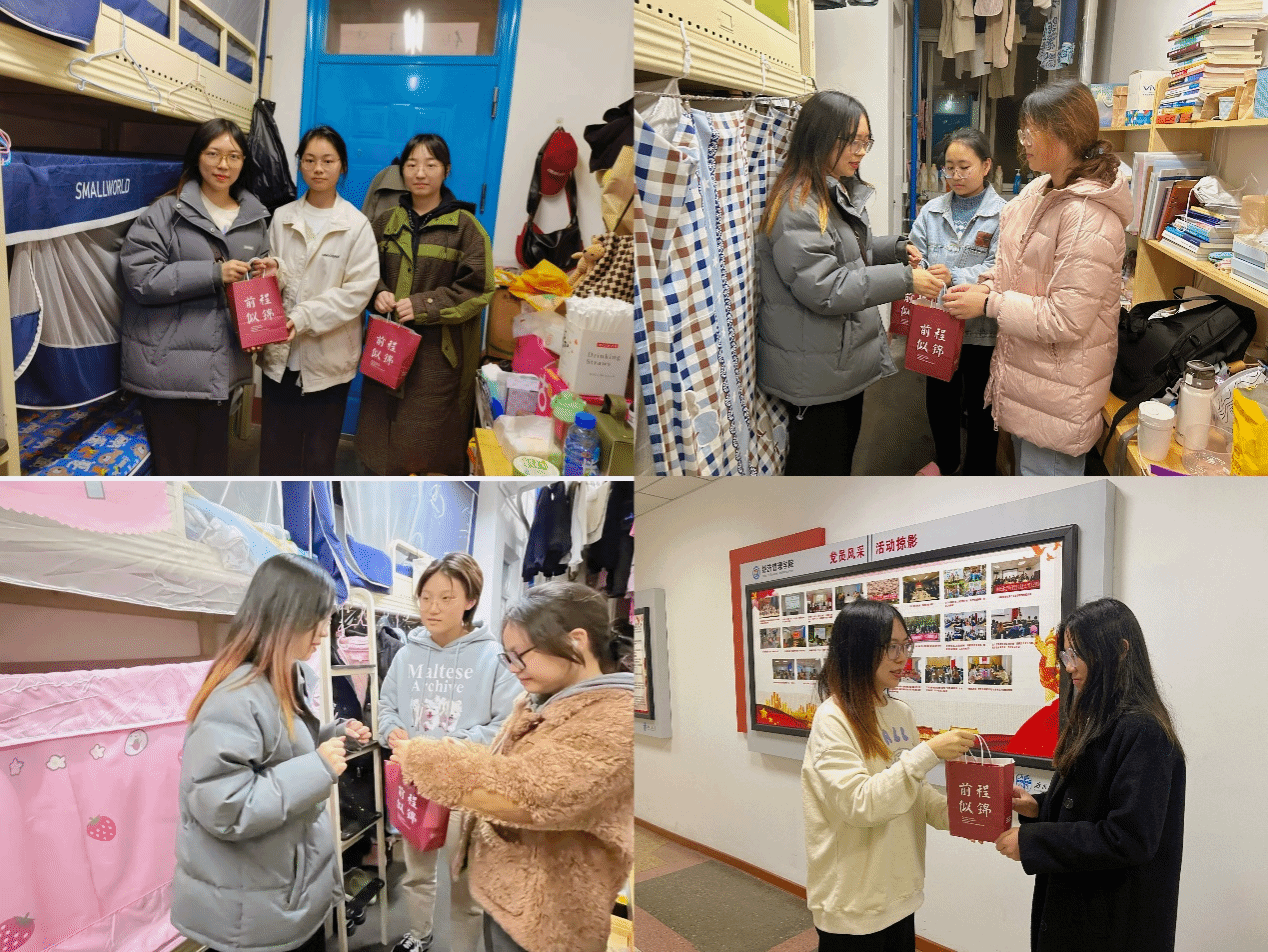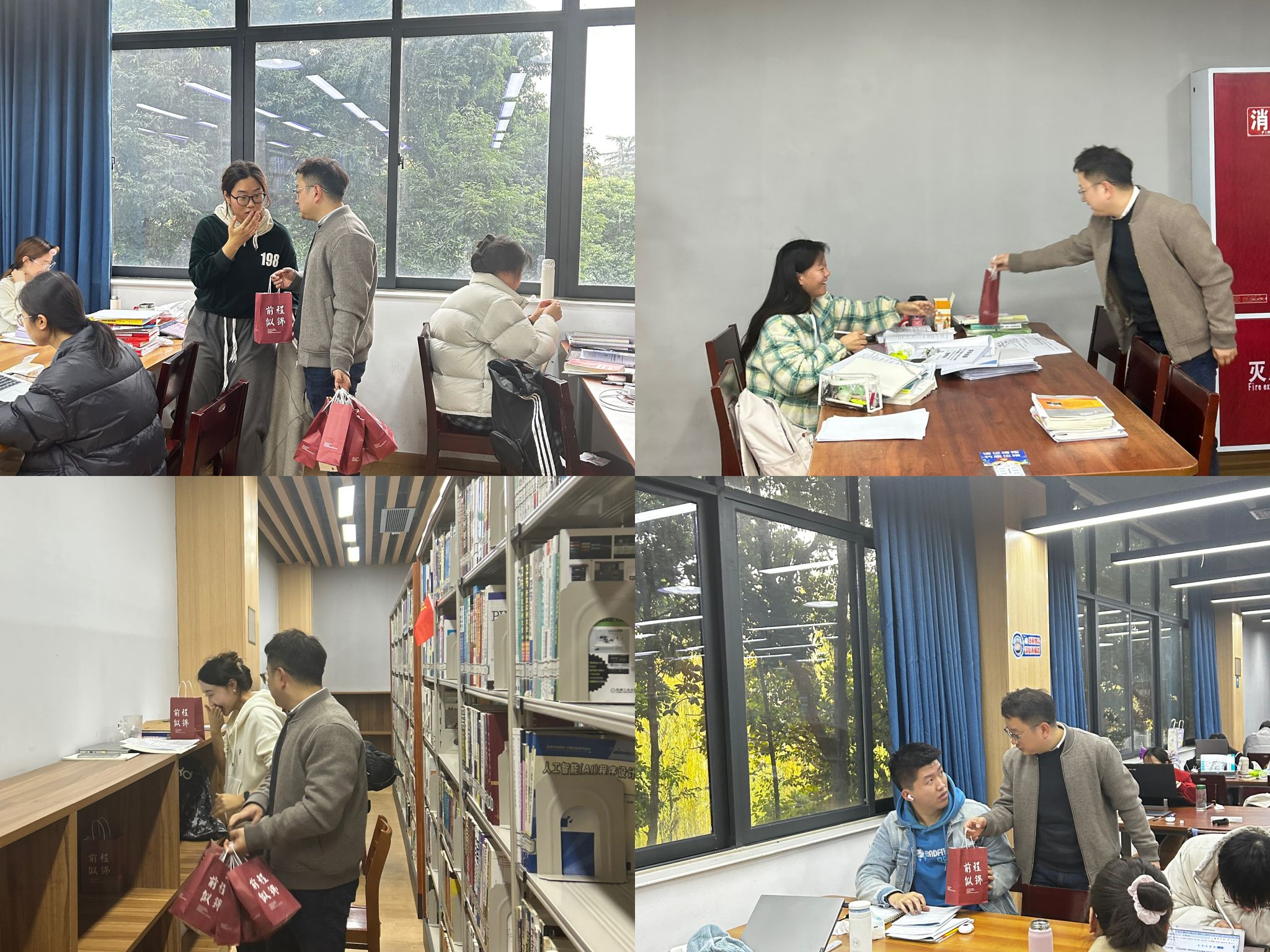 同时,本科2020级辅导员老师陈建奇、尹玉萌在活动结束后来到图书馆、自习室和员工寝室,为因事未能参加本次活动的考研学子送上公司和老师们的温暖心意,表达对他们的美好祝愿。