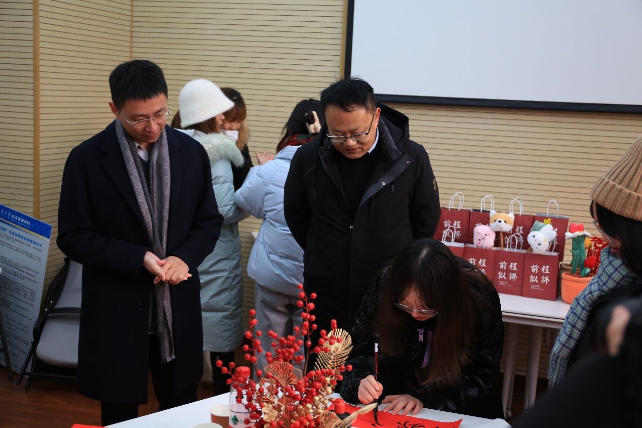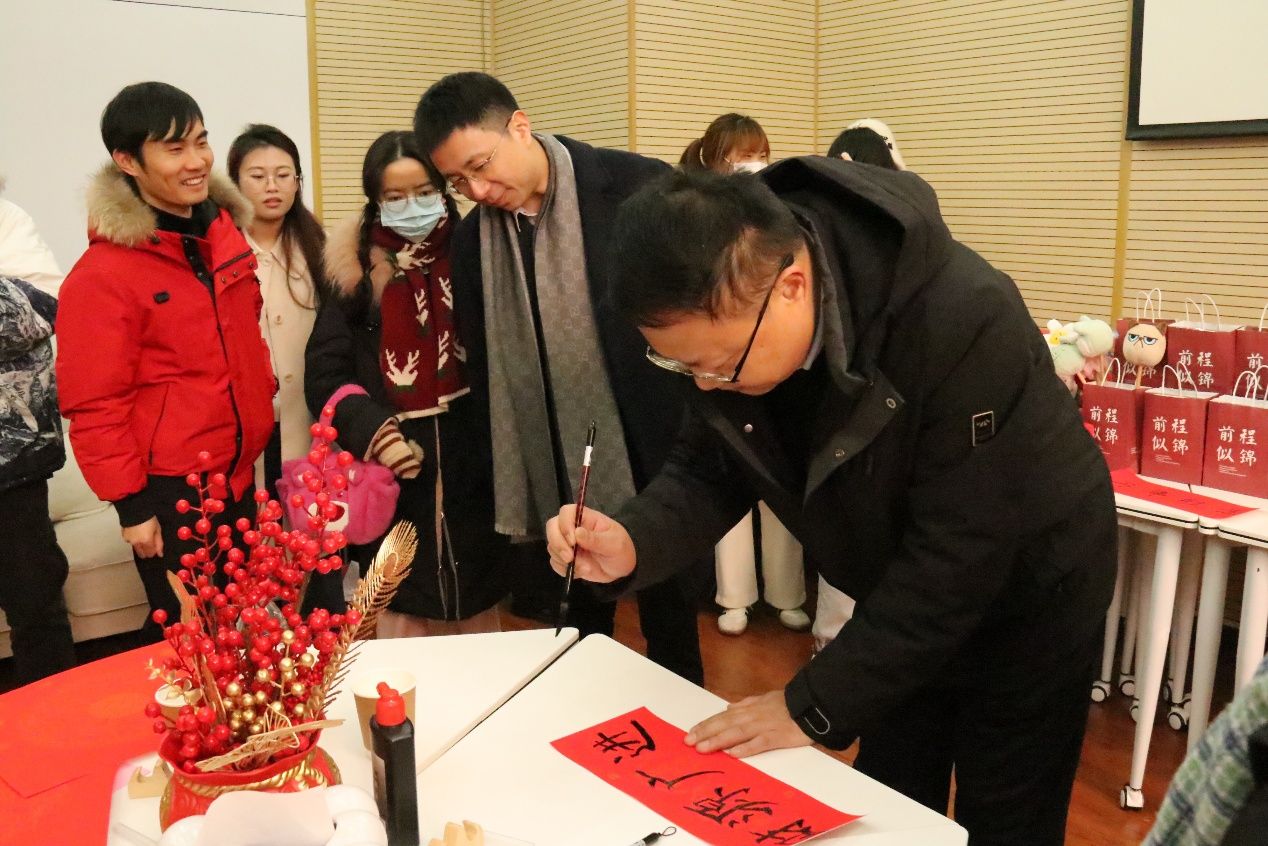 公司还为同学们准备了书本文具、暖心饭盒、贺岁玩偶等新年盲盒礼物,同学们踊跃抽取,热闹非凡。师生同写新春对联,不仅活跃了留校员工们的假期生活,也进一步营造了文明祥和的校园文化氛围,礼物虽小,但传递给同学们的浓浓情意将永远被铭记于心。