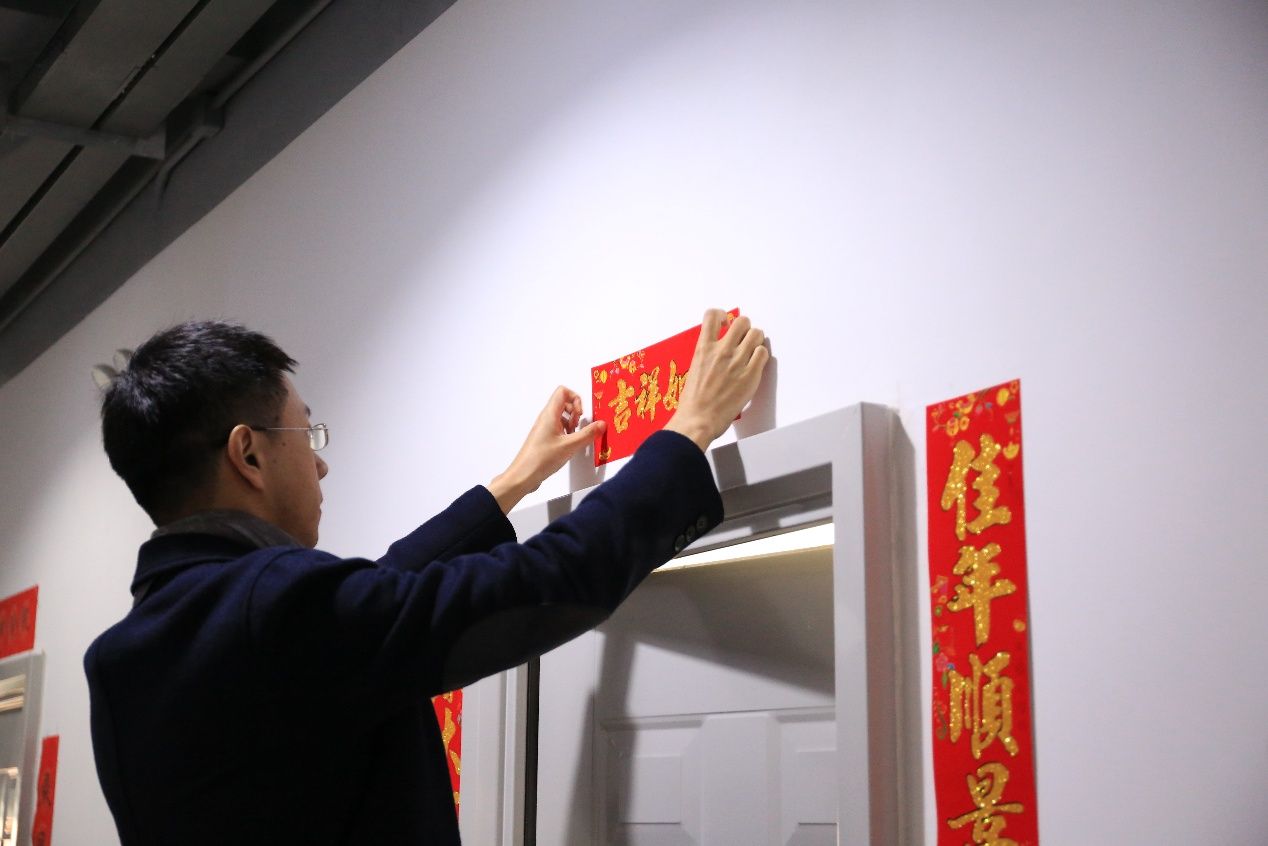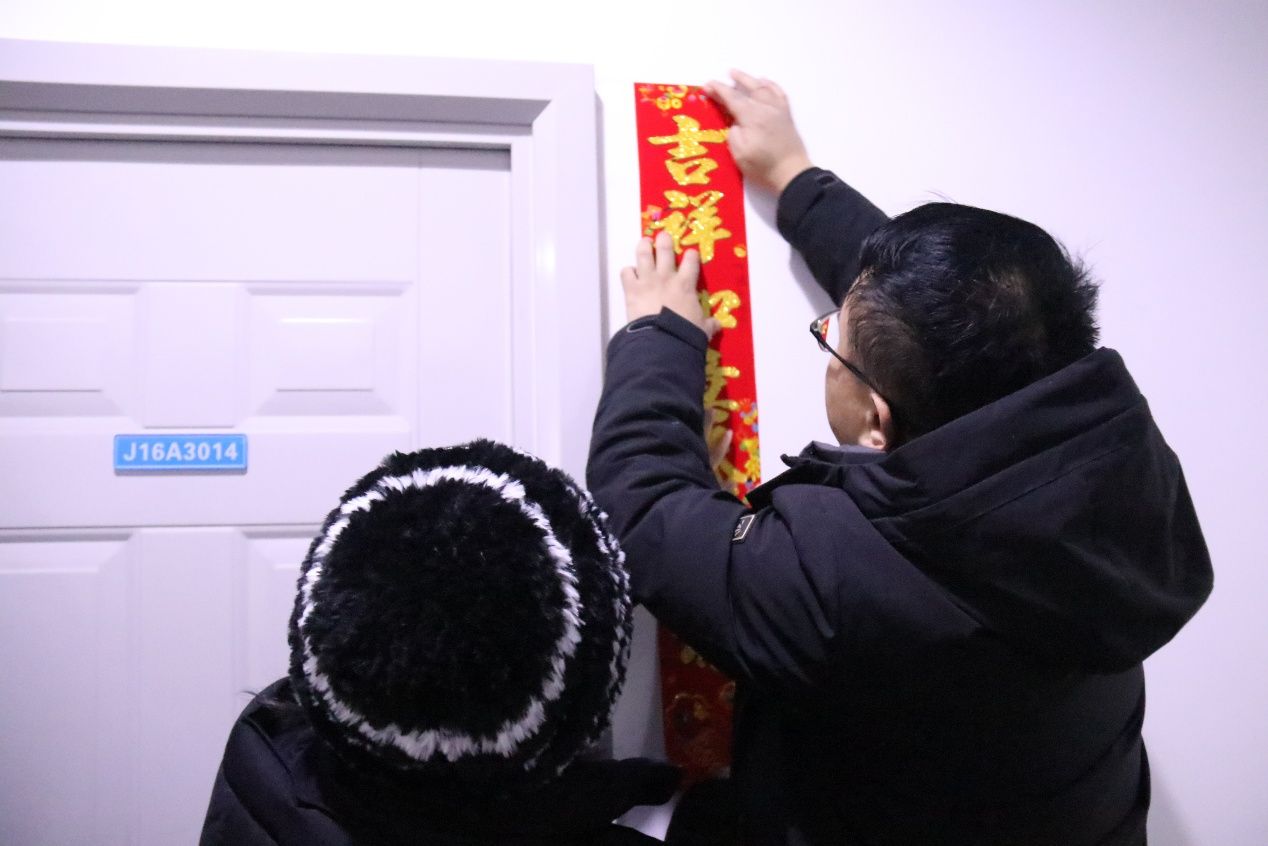 贴春联,献祥瑞。公司为留校的同学精心准备了春联、福字,党委书记郭强、经理韩科与同学们一同贴春联迎春纳福,留校同学们也纷纷亲手为宿舍贴上新春福字,“福”字不仅寄托着同学们对未来在校生活的美好向往,还承载着公司、老师们对同学们求员工涯的美好祝愿。一幅幅鲜艳的春联给宿舍增添了亮色,一句句祝福给同学们送去欢乐和温暖。祈福迎祥,岁月安康,送春联、贴福字活动不仅丰富了师生的寒假生活,弘扬了中华优秀传统文化,也为大家营造了欢乐、喜庆、祥和的春节气氛。