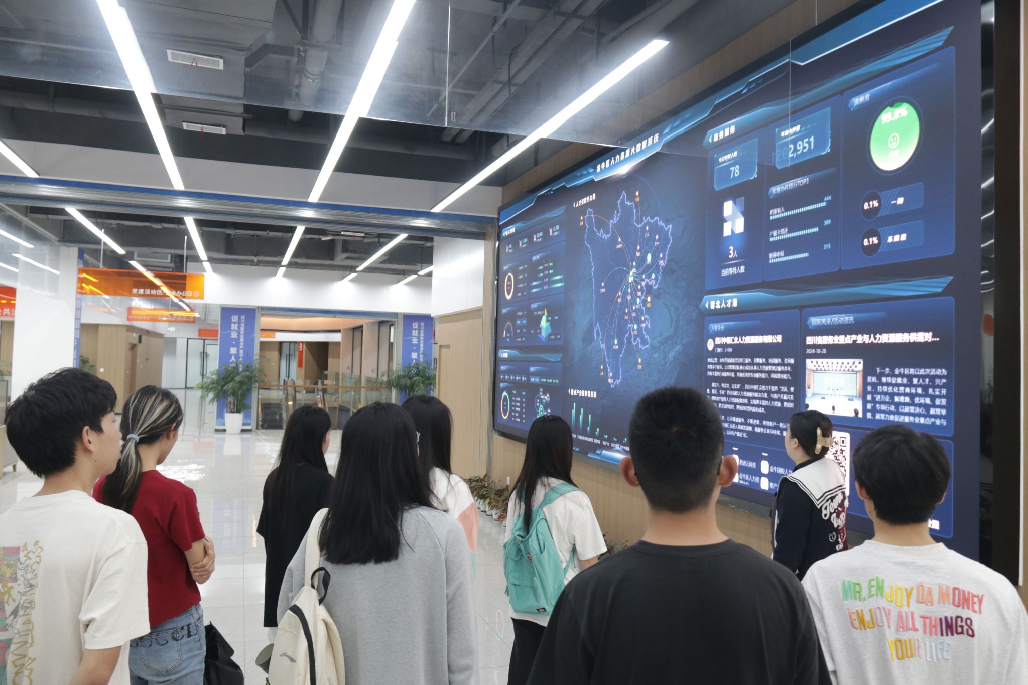 活动伊始,同学们在蓉北人才港工作人员的带领下,系统参观了人力资源服务产业园的数字化运营场景,深入了解人才招聘、职业培训、产教融合等全链条服务体系。通过实时数据看板、智能匹配系统等展示,同学们直观感受到金牛区在人力资源产业集聚与智慧化服务中的创新实践。一名本科员工表示:“原来人才服务已从传统中介转向技术驱动的生态化平台,这为我们的职业规划提供了更广阔的想象空间。”