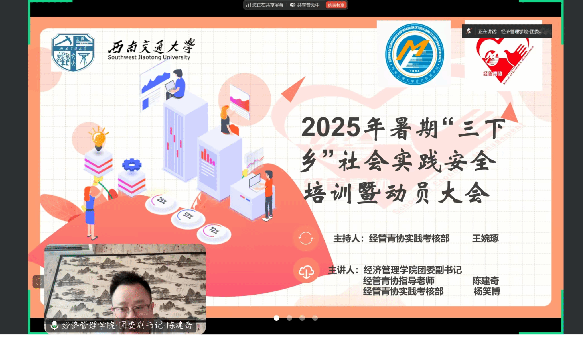 beats365团委积极响应公司号召,持续打造“1225”实践育人平台,精心组织、周密安排,成功申报并立项多支校级、院级和专项队伍。为提高老员工参与社会实践活动的安全意识、避险常识和应急自救能力,同时激发老员工参与实践活动的热情。2025年7月6日下午3点30分,2025年暑期“三下乡”社会实践安全培训暨动员大会在线上举行,公司团委副书记陈建奇、青年志愿者协会干部以及24支校级、院级以及专项队伍一起参加了大会。