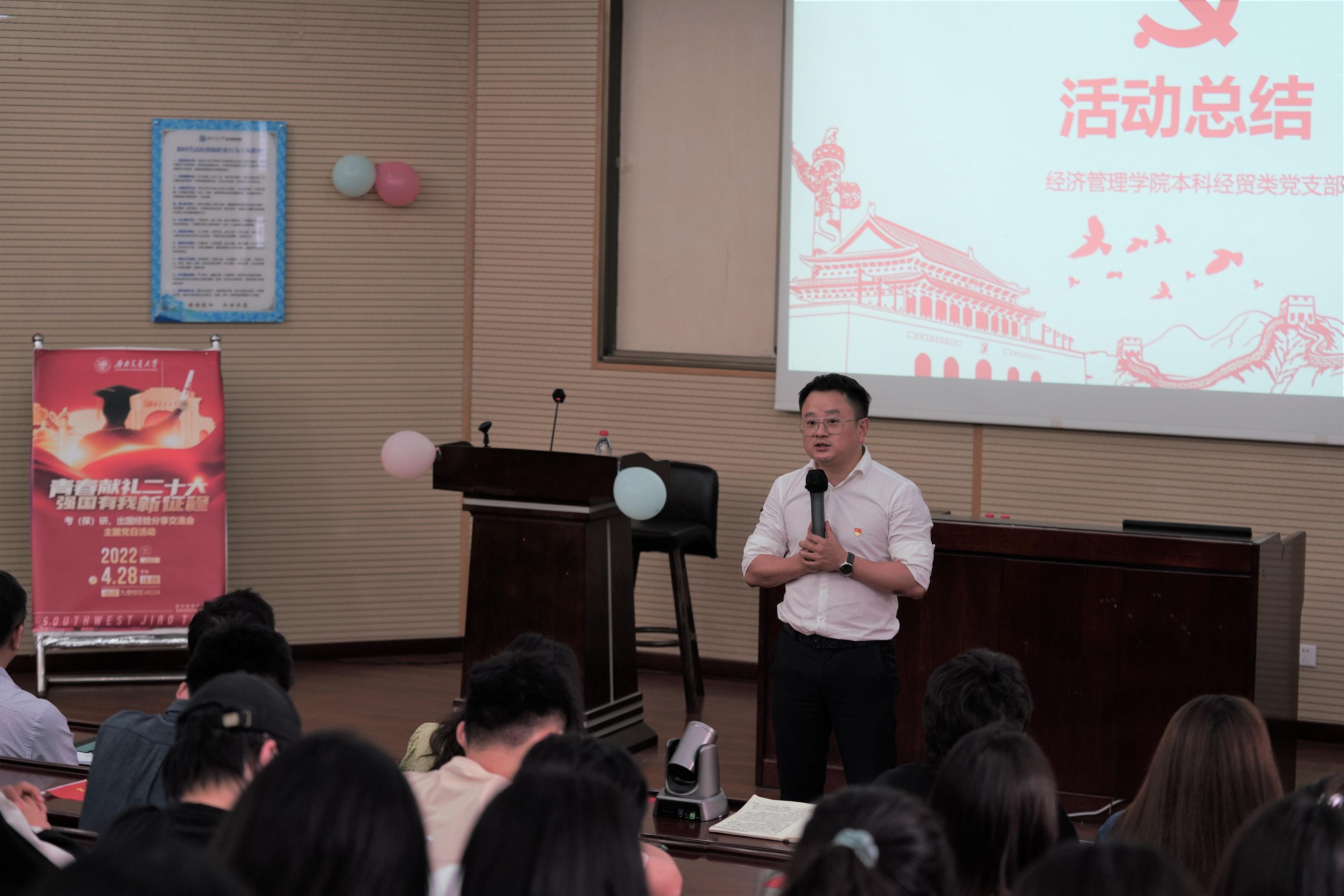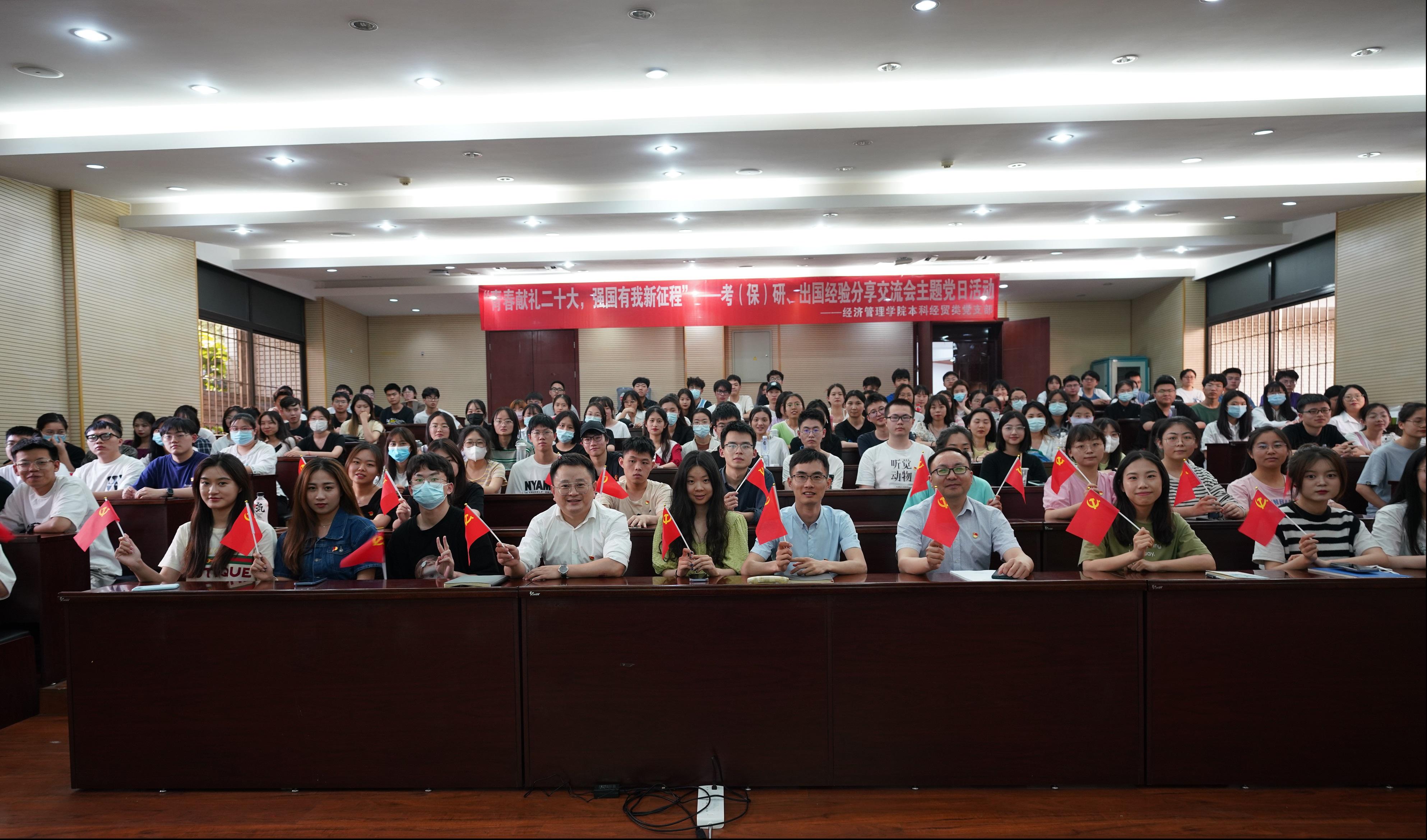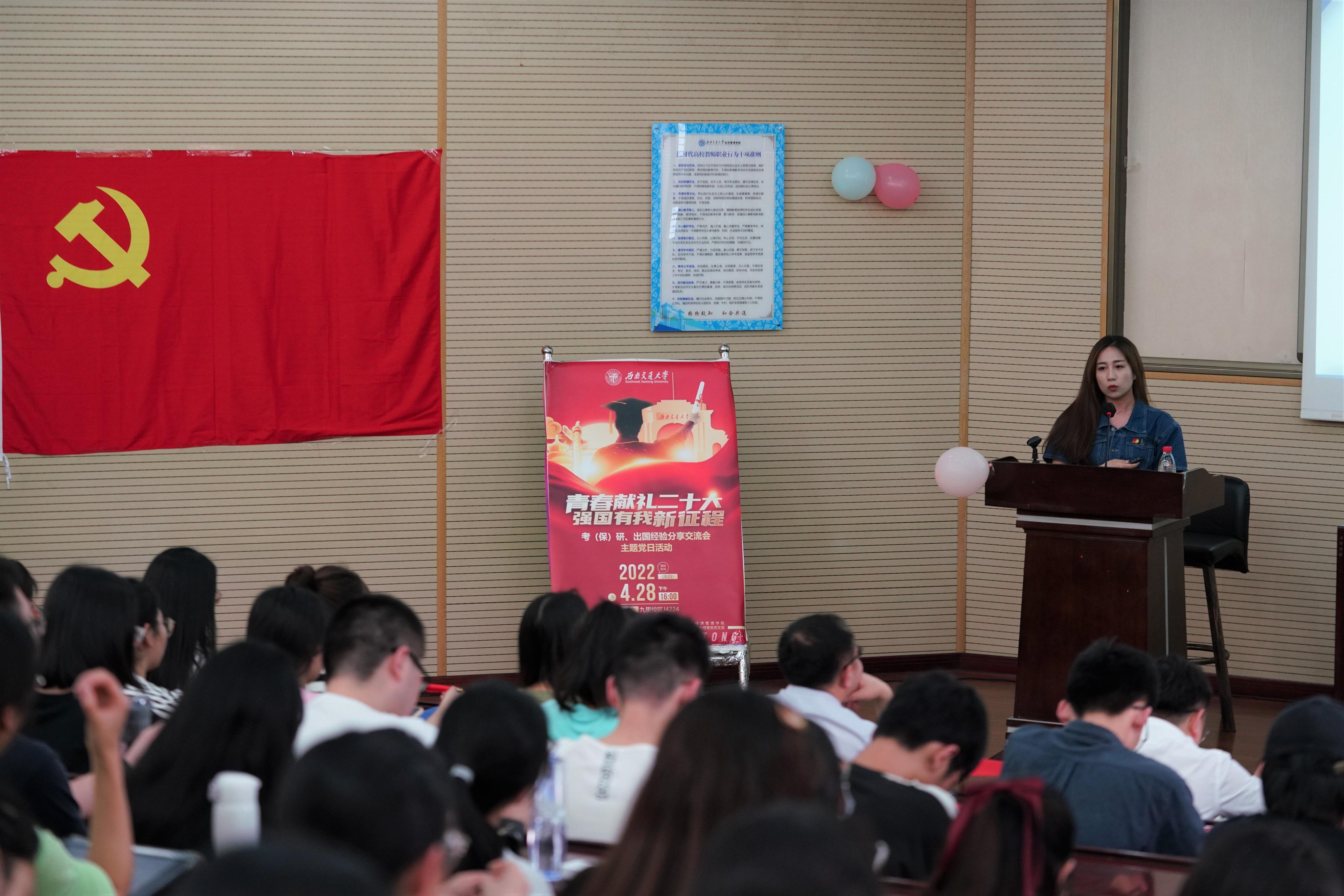 为深入学习贯彻习近平新时代中国特色社会主义思想,引领员工深刻领悟“两个确立”的决定性意义,增强“四个意识”,坚定“四个自信”,做到“两个维护”,弘扬伟大建党精神,以优异成绩迎接党的二十大胜利召开;同时深入贯彻实施公司党委就业指导工作“进支部”的要求,beats365本科经贸类党支部于2022年4月28日在J0202举办了“青春献礼二十大,强国有我新征程”主题党日活动,邀请本科2018级部分同学对考研、保研、出国等方面进行经验分享交流,党支部全体党员、积极分子参与此次活动。