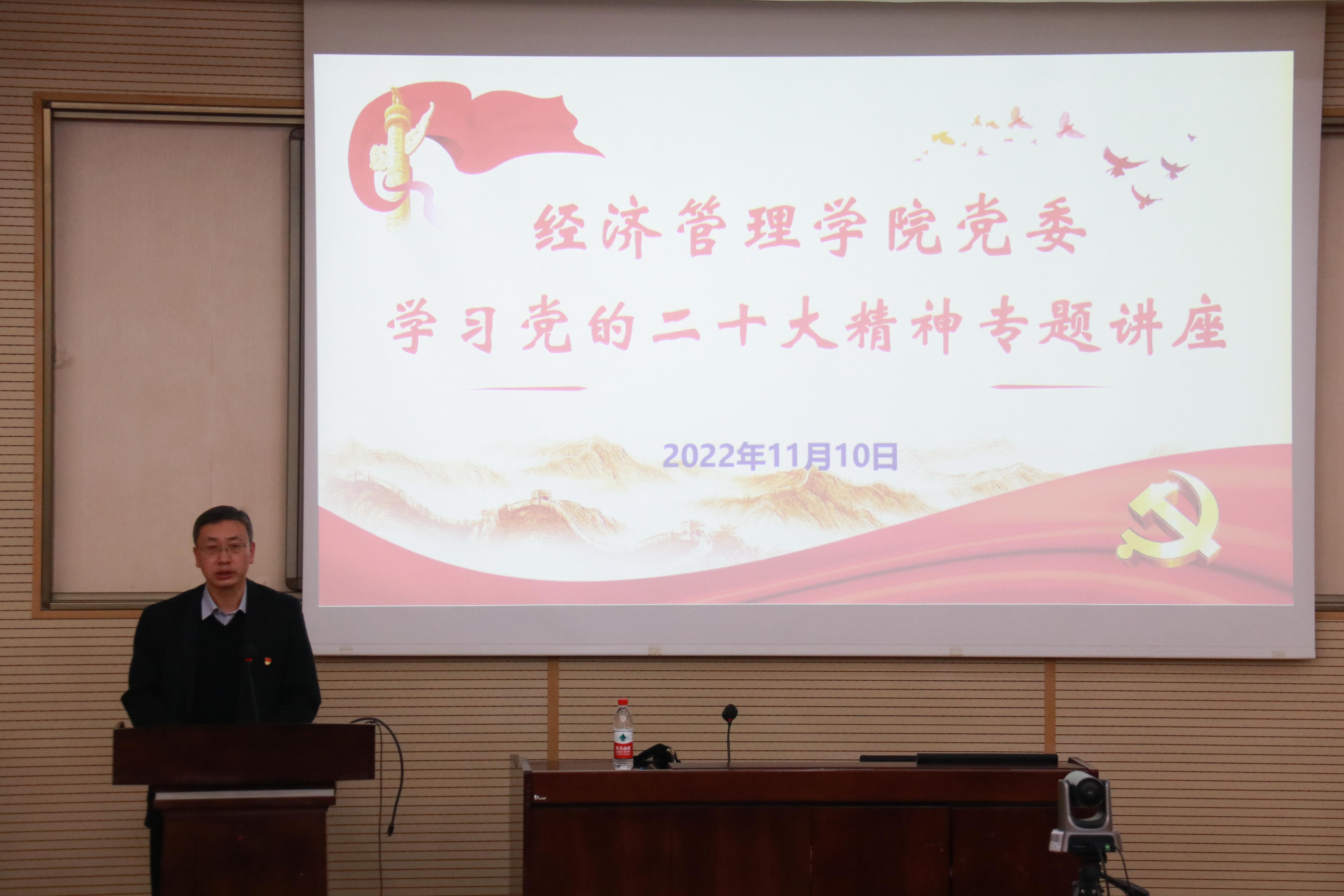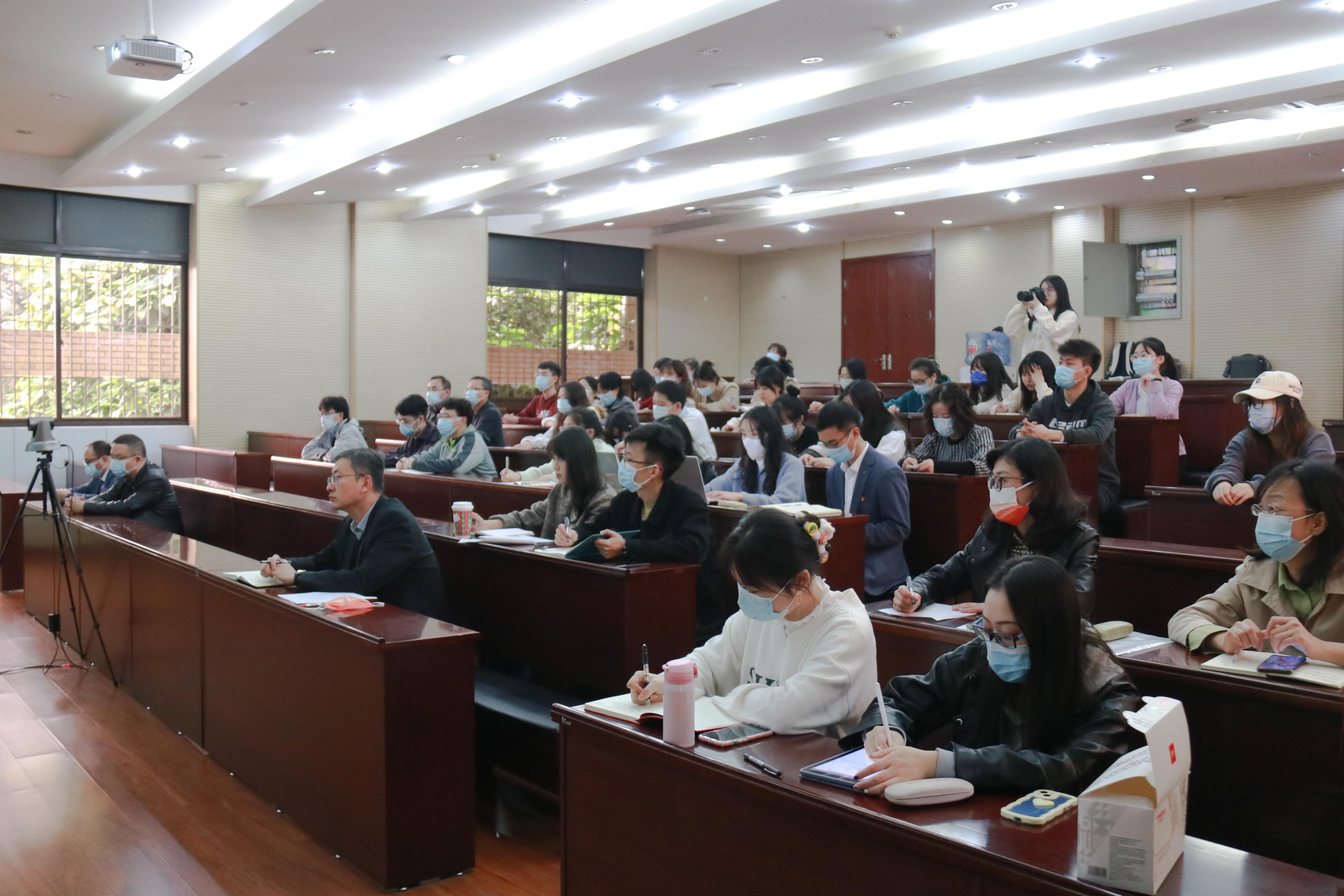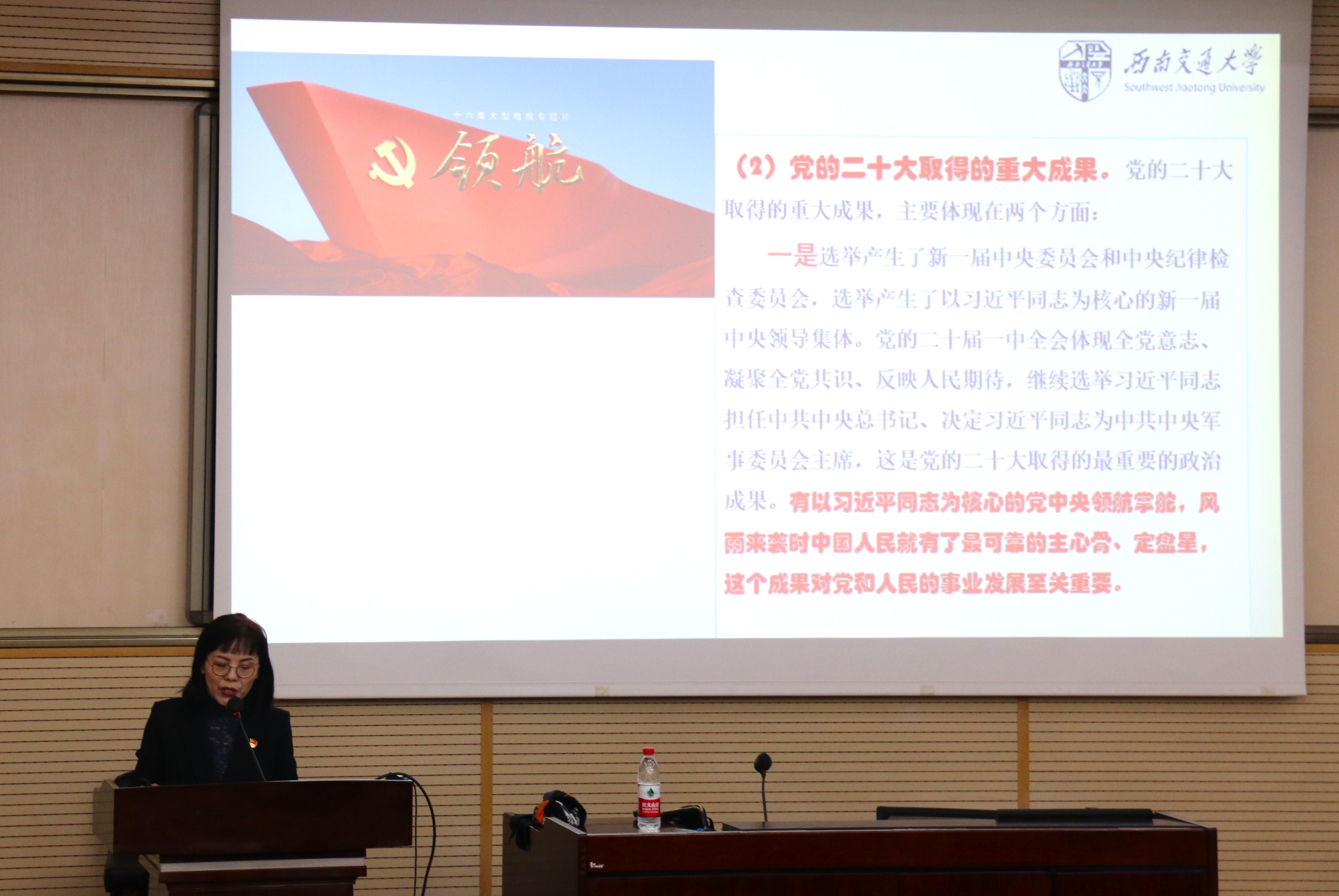 为深入学习贯彻党的二十大精神,beats365党委特邀四川省委宣讲团专家库成员、beats365官方网站马克思主义公司教授何薇老师于11月10日下午在九里校区0202教室作题为《学报告悟思想开新局——深入学习领会党的二十大精神 坚定不移推进全面从严治党》的专题报告。讲座由公司党委书记王斌主持,公司党委委员、院领导、各师生党支部委员参加了此次专题讲座。