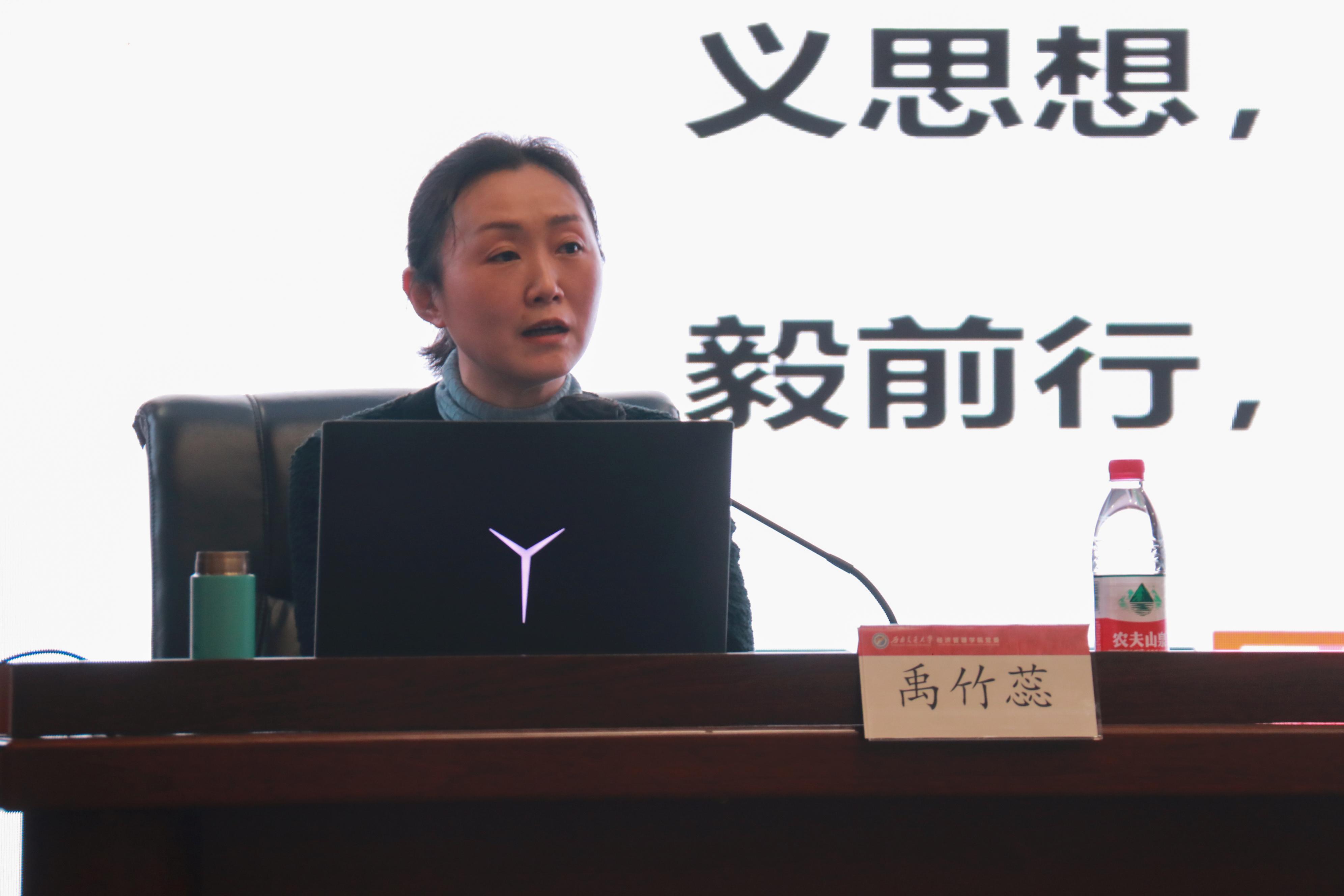 禹竹蕊教授首先向大家解读了党的二十大的主题以及二十大报告的总体结构。她指出,学习贯彻党的二十大精神,必须做到习近平总书记提出的“五个牢牢把握”,接着,她主要围绕“立足成就看成因”、“立足使命看革命”、“立足要义看要求”三个方面,并结合自身学习体会深入解读了党的二十大精神。