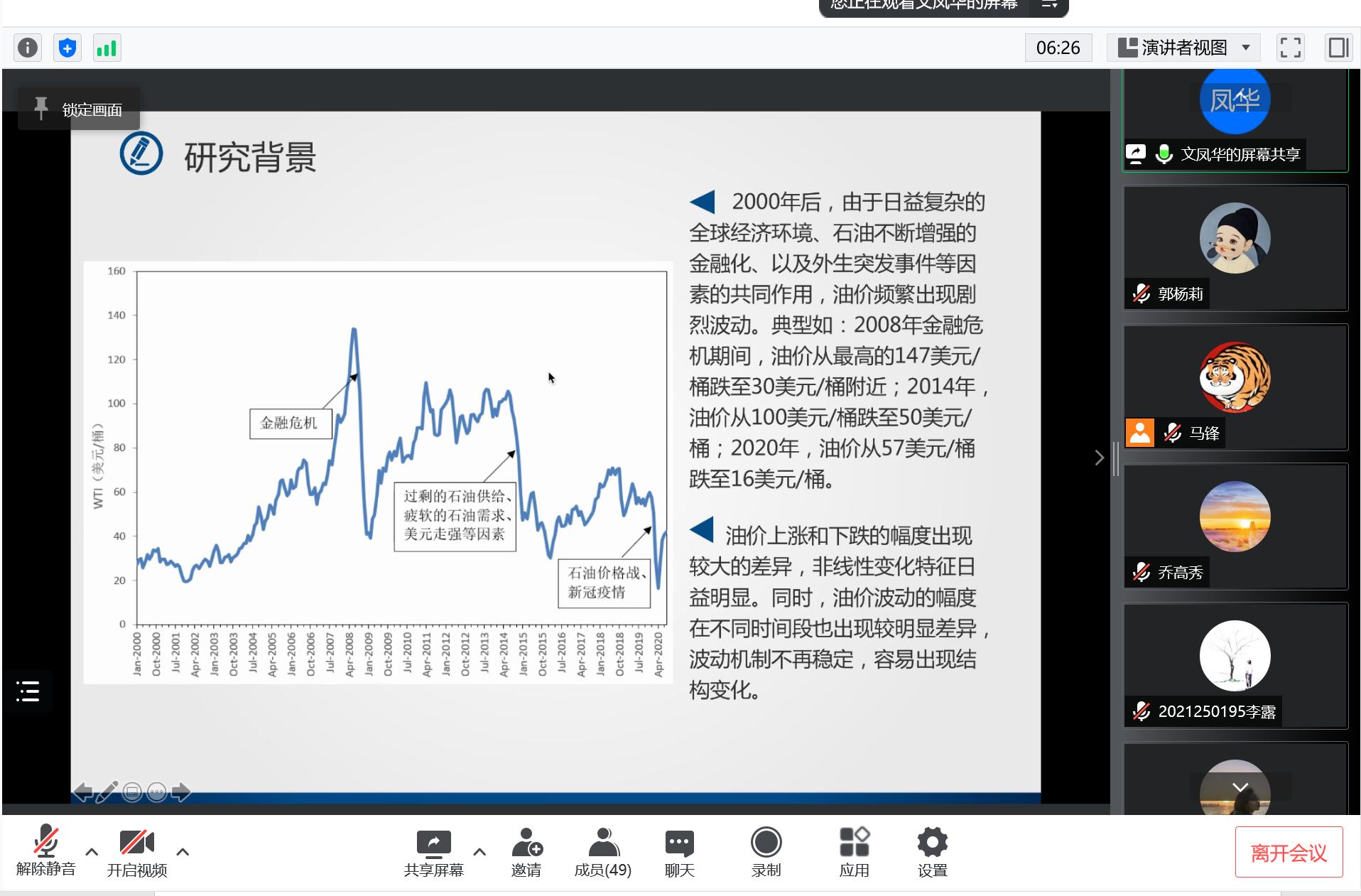 文凤华教授首先介绍了文章的研究背景,对石油价格与美元汇率的互动关系以及油价不确定性对中国股市的影响进行了详细讲解,指出美元汇率和石油价格存在双向因果关系;油价不确定性的增大意味着石油市场变得更不稳定,是“坏消息”,相反是“好消息”。因此油价不确定性的增大和减少冲击对股市也可能有非对称影响。