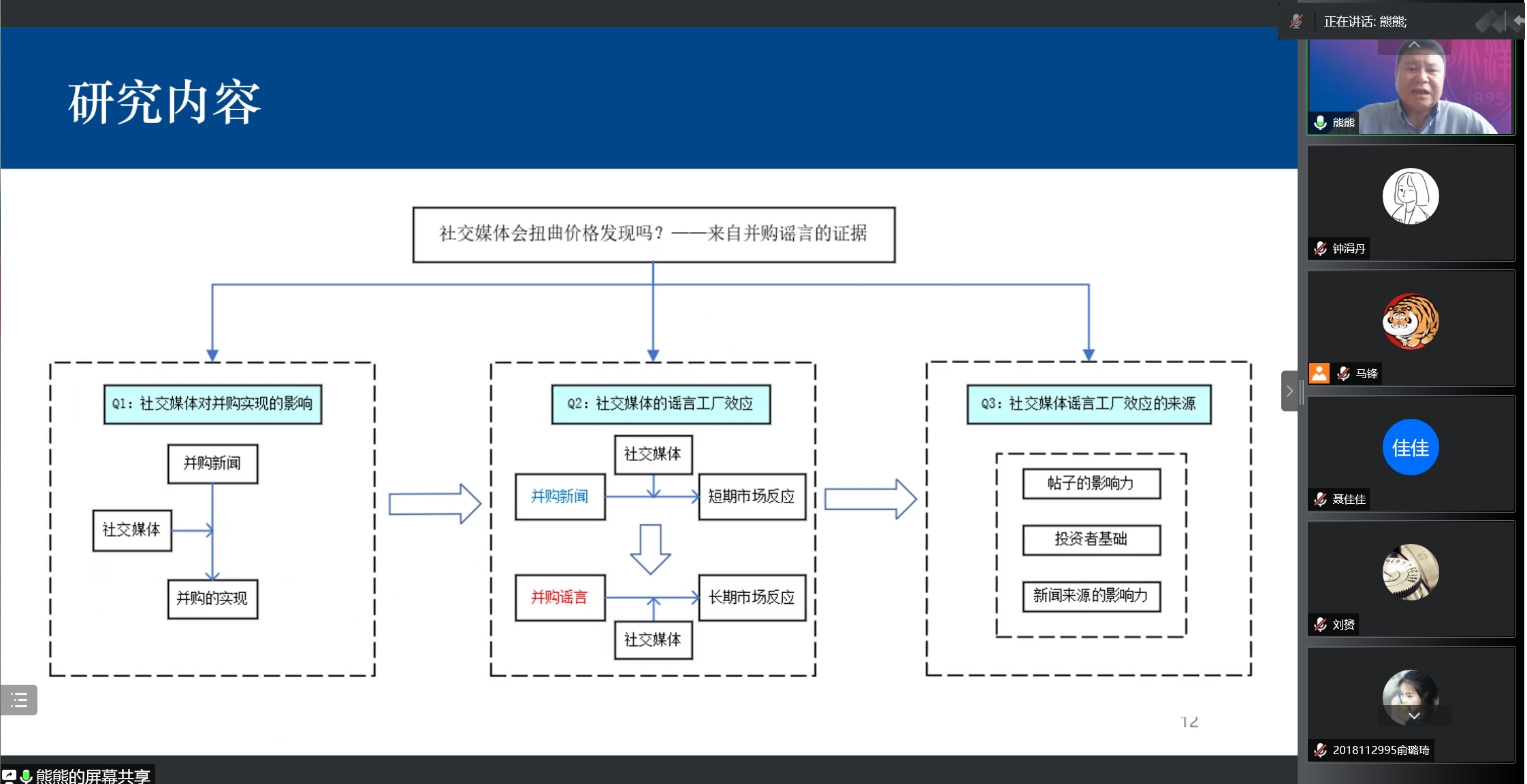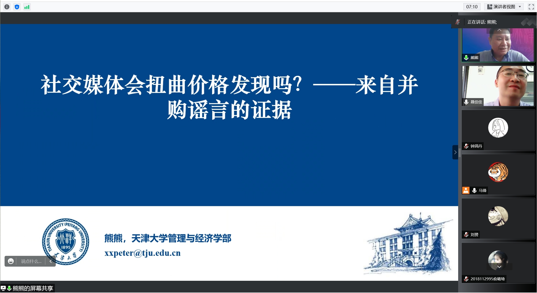 2022年6月16日上午10点,天津大学管理与经济学部熊熊教授应邀以“社交媒体会扭曲价格发现吗?来自并购谣言的证据”为题给公司师生带来一场线上学术讲座。讲座由beats365副经理聂佳佳教授主持,本次学术活动由公司金融市场与公司金融科研团队承办,金融与财务学系朱宏泉教授、马锋副教授、梁超老师及30余名研究生在线上参加本次学术活动。