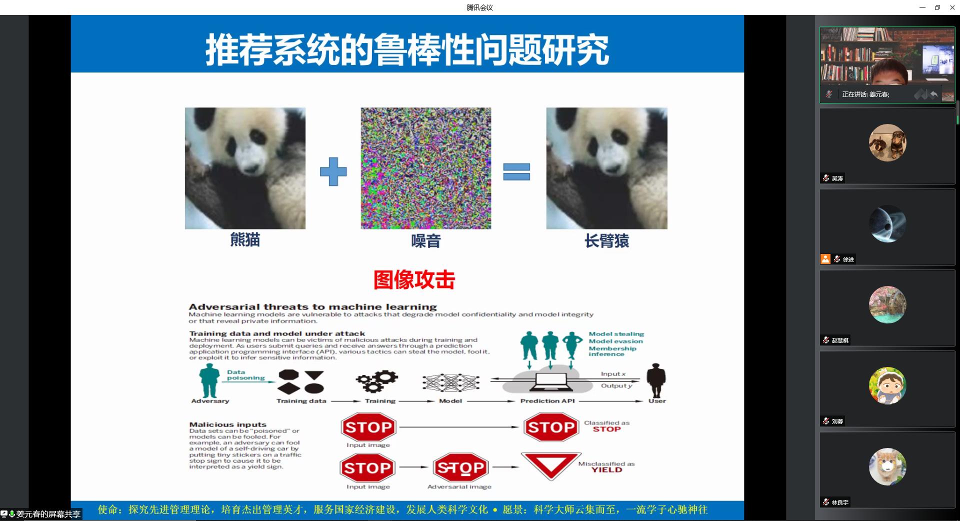 讲座分享环节,姜元春教授介绍了个性化推荐中的情境多元化、数据异构化、技术深度化、目标多样化,并分享了相关的个性化推荐实例,包括图像、语音、文本等数据在推荐系统中的应用。随后姜元春教授介绍了推荐系统的鲁棒性问题研究,介绍了面对图像攻击、文本攻击的鲁棒优化方法。