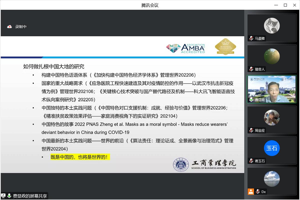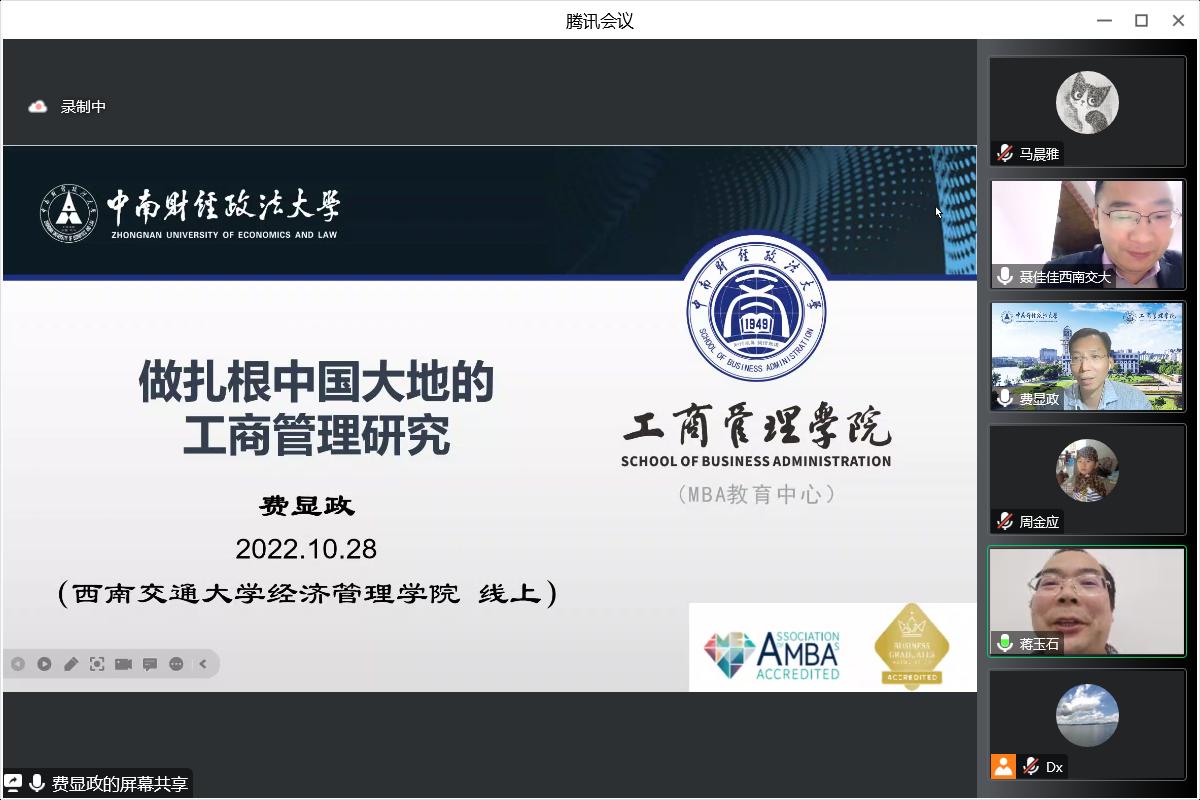 2022年10月28日19:00,中南财经政法大学工商管理公司副经理费显政教授应邀为公司师生带来题为“做扎根中国大地的工商管理研究”的线上讲座。本次学术活动由市场学系蒋玉石教授主持,校内外师生80余人参加了本次讲座。