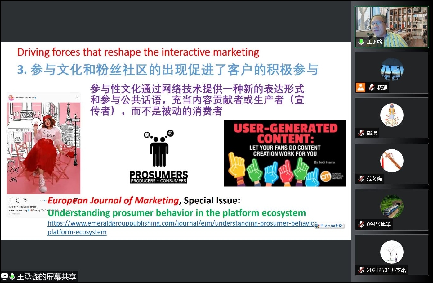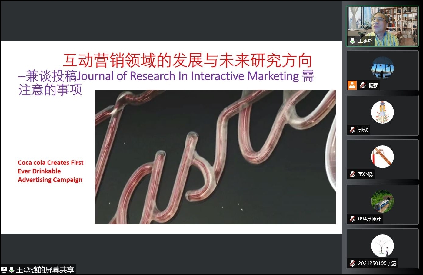 2022年4月21日上午9:00,美国纽黑文大学商公司营销学终身教授王承璐博士应邀以“互动营销领域的发展与未来研究方向”为题为公司师生进行线上学术报告。本次学术活动由公司市场学系蒋玉石教授主持,公司部分教师及80余名研究生参加了本次讲座。