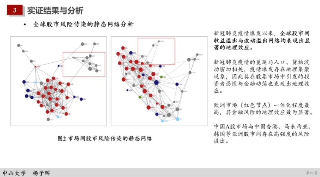 首先杨子晖教授介绍了论文的研究背景以及研究意义,然后对论文的实证以及结果进行了更为详细的阐述。杨子晖教授提到这篇文章基于最新发展的弹性网络收缩技术(Elastic Net Shrinkage)构建高维风险传染网络,考察新冠疫情冲击下国际资本市场间的风险传染关系,并对金融风险的扩散路径与驱动机制展开深入研究。通过实证研究,杨子晖教授得出了以下结论:与传统的风险网络相比,突发公共卫生事件背景下,金融风险传染的地理效应更为明显,中国A股市场与亚洲地区的股票市场间存在高强度的风险溢出;疫情较为严重、资本开放程度较高、经济较为发达的地区是全球主要的系统性金融风险输出节点;对于贸易依存度与资本开放度较高的经济体间,系统性金融风险的传染效应更为明显。总的来说,杨子晖教授这一研究具有重要的学术价值与现实意义。