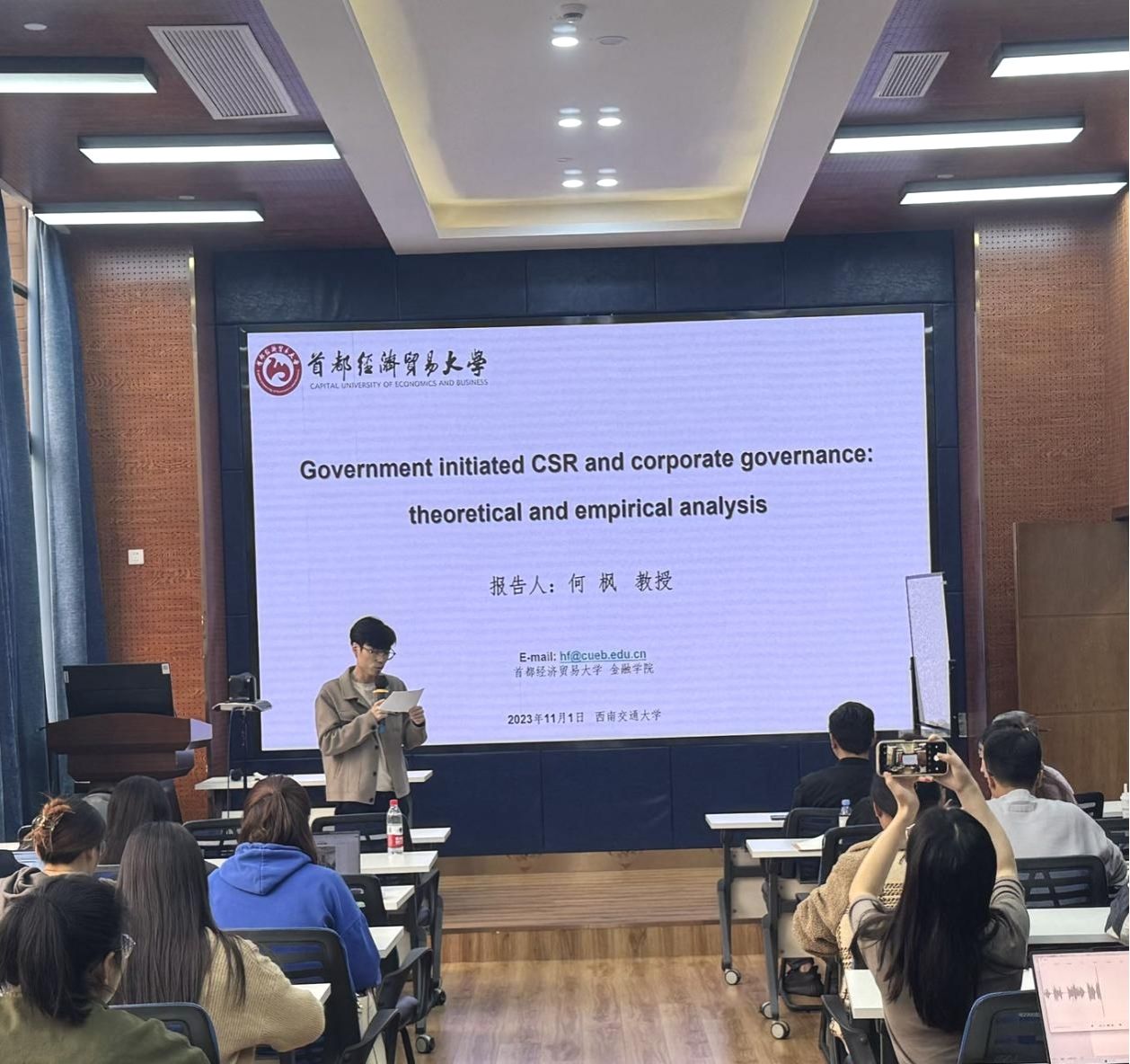 2023年11月1日下午15:00,首都经济贸易大学金融公司何枫教授应邀在九里校区0218室为公司师生作了一场题为“Government initiated CSR and corporate governance: theoretical and empirical analysis”的讲座。此次学术活动由公司金融与财务学系马锋副教授主持,公司部分教师以及研究生参加此次活动,马锋副教授对何枫教授的学术成果进行了介绍,同时对何教授的到来表示热烈的欢迎和感谢。