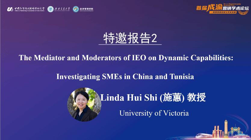 第二场特邀报告中,来自加拿大维多利亚大学(University of Victoria)商公司的Linda Hui Shi(施蕙)教授作了主题为“The Mediator and Moderators of IEO on Dynamic Capabilities: Investigating SMEs in China and Tunisia”的报告。她与合作者们研究了企业动态能力在国际创业导向与绩效关系中的中介作用,分析了制度距离与文化距离的调节作用,为发展中国家创业企业如何通过国际化与数字化手段来克服文化与制度的障碍提供了新的解释。