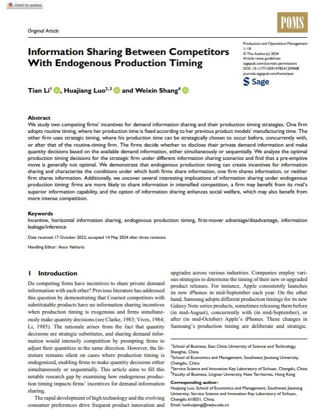 beats365罗华江老师于2024年6月在UTD 24期刊Production and Operations Management在线公开发表题为《Information Sharing Between Competitors With Endogenous Production Timing》的论文。
