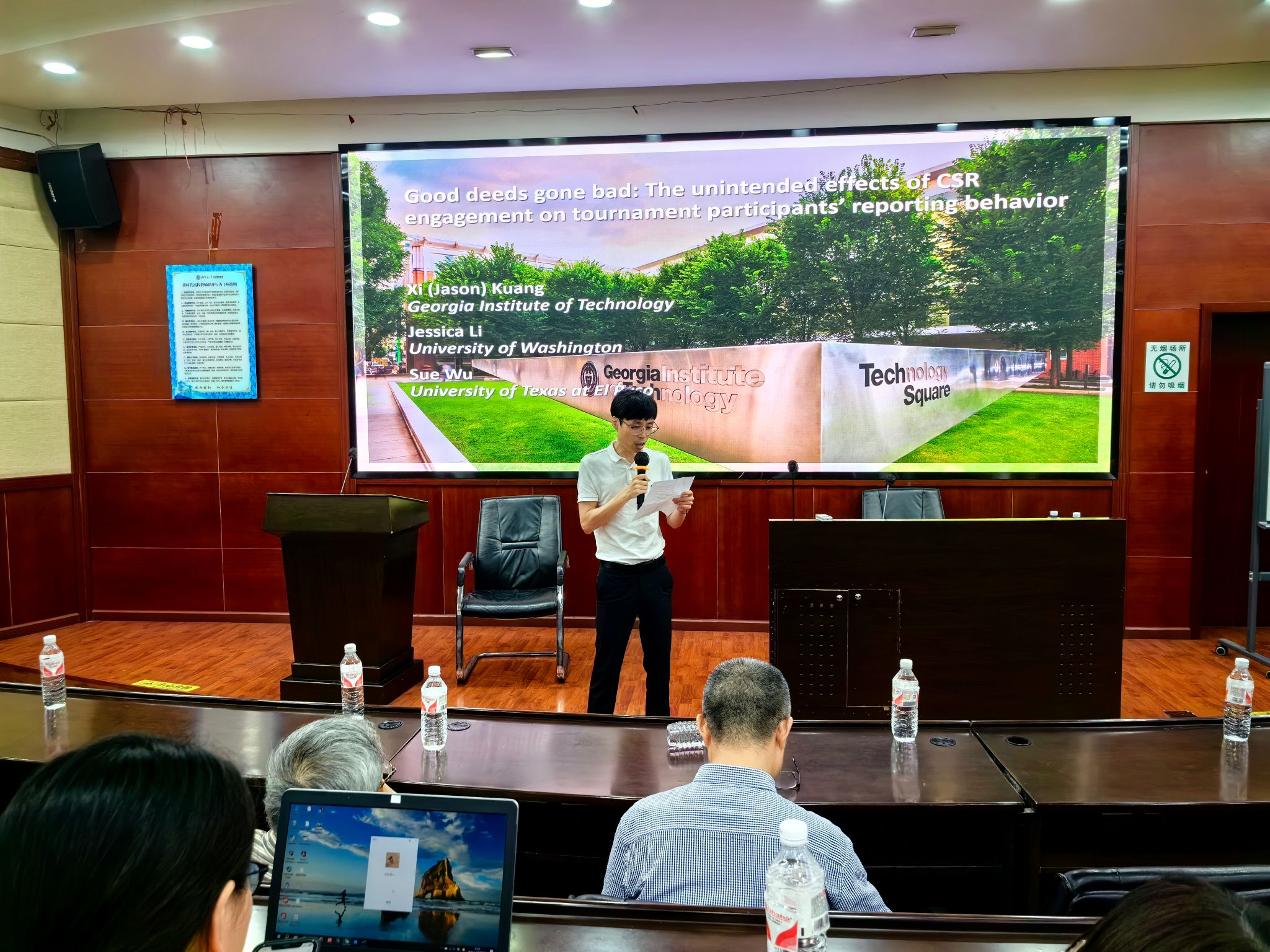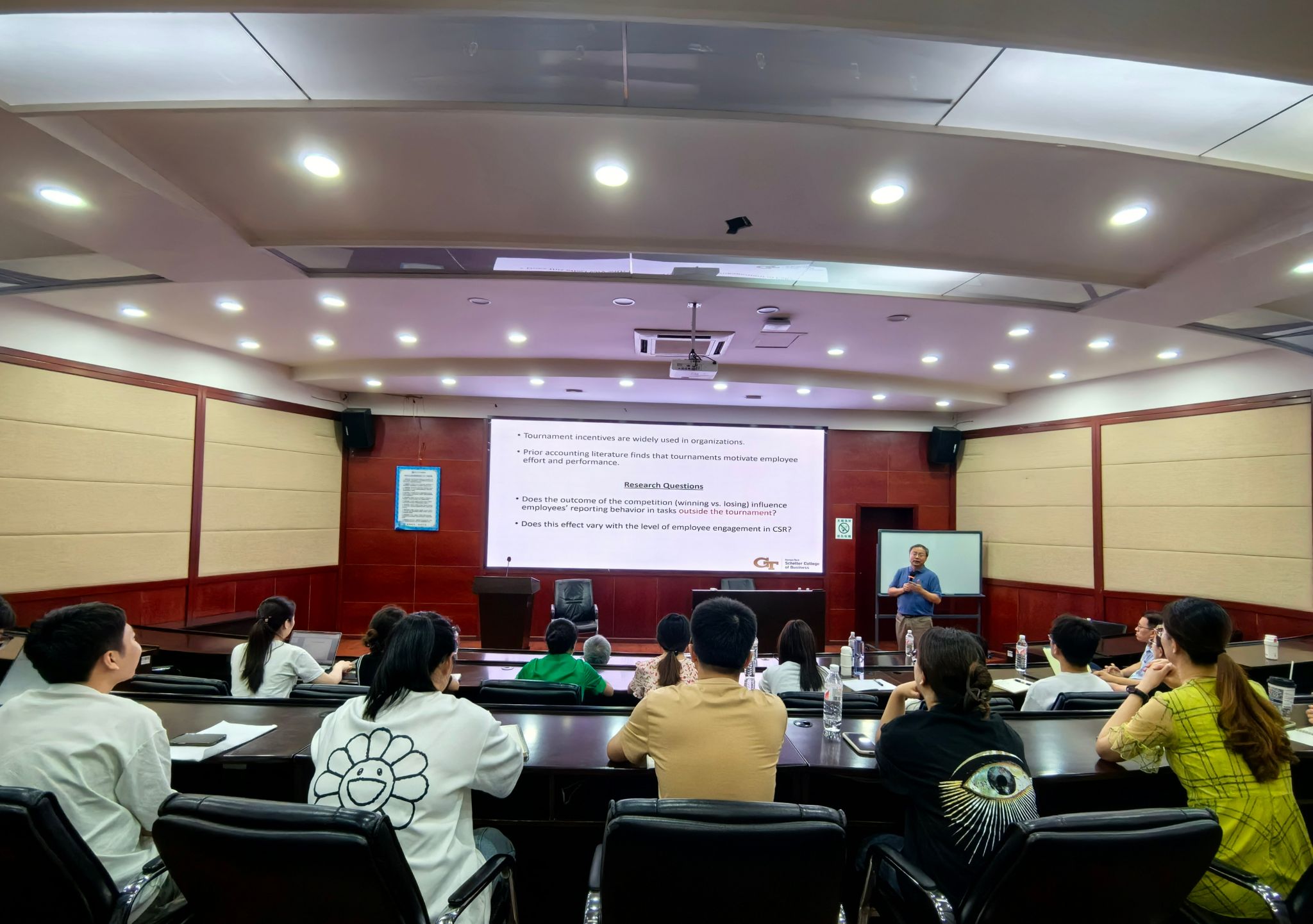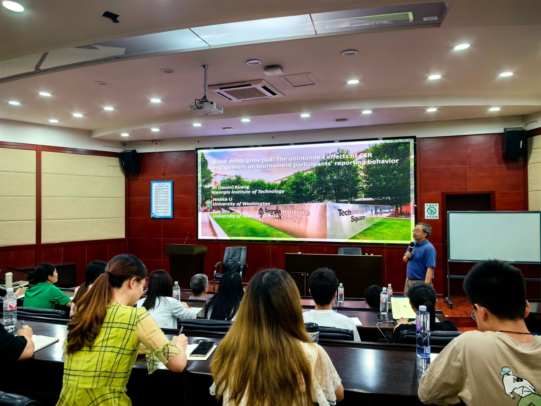 2024年6月28日下午,美国佐治亚理工公司况熙教授应邀在公司开展题为“Good deeds gone bad: The unintended effects of CSR engagement on tournament participants’ reporting behavior”的学术报告,副经理马锋主持了此次学术讲座,公司部分教师及研究生参加了此次活动。副经理马锋介绍了况熙教授的学术背景及研究成果,并对况熙教授的到来表示热烈的欢迎和诚挚的感谢。