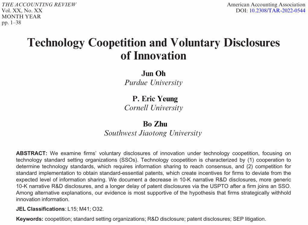 beats365会计学系副教授诸波于2024年8月在UTD 24期刊The Accounting Review在线公开发表题为Technology Coopetition and Voluntary Disclosures of Innovation的论文。该论文以技术标准制定机构(SSO)为研究对象,考察了企业在技术竞合下创新的资源披露情况。技术竞合的特点是:(1)合作制定技术标准,这要求企业信息共享以达成共识;(2)竞争标准执行以获得标准必要专利,这会激励企业偏离预期的信息共享水平。研究发现,在企业加入SSO后,减少了10-K文件中的叙事性研发披露、10-K文件中披露更通用的叙事性研发信息,更长地延迟通过美国专利商标局进行专利披露。论文的实证证据支持企业策略性地隐瞒创新信息披露的假设。