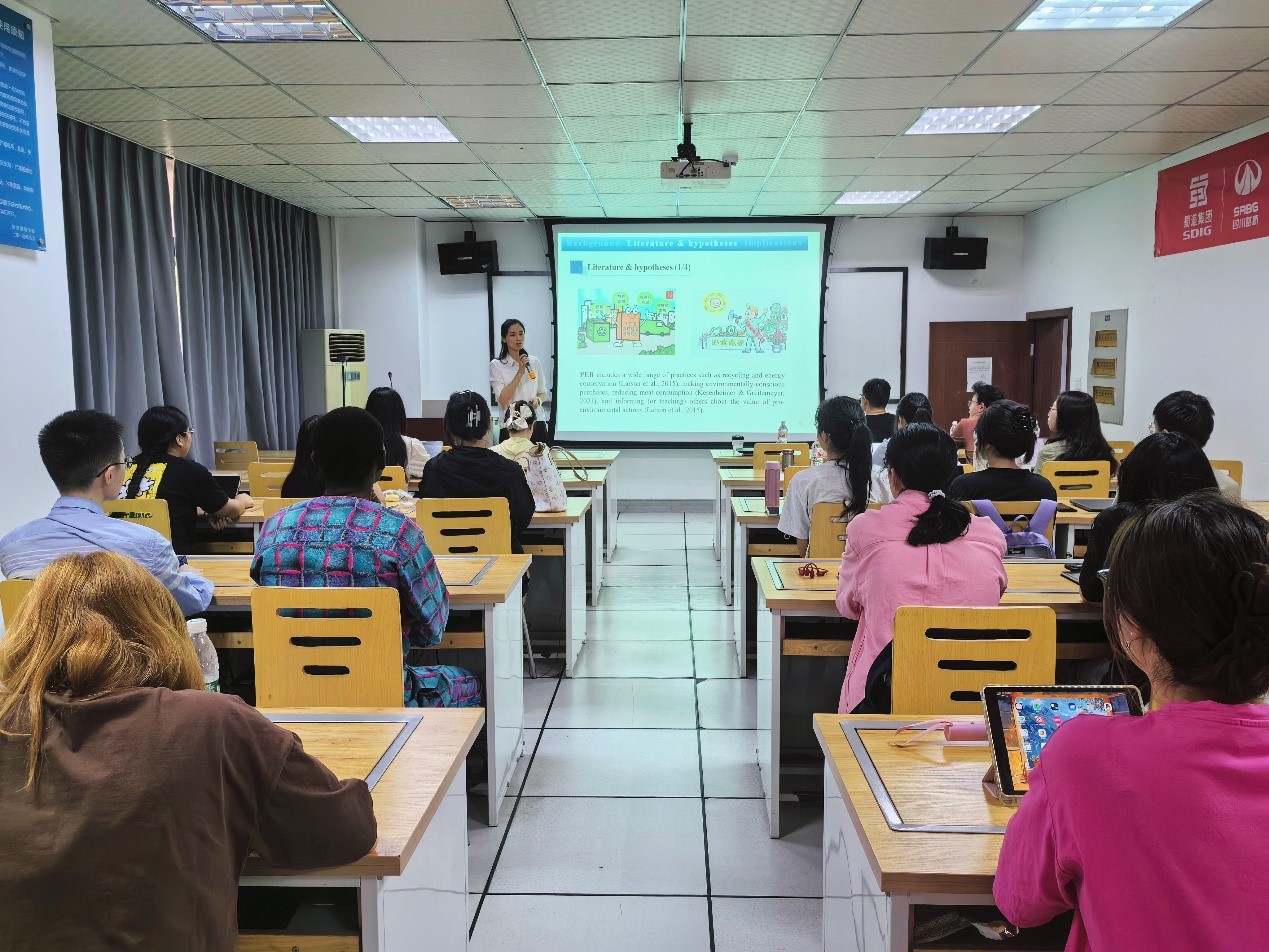 随后,张博士系统概述了当前关于人工智能服务与消费者可持续行为的研究进展。她重点介绍了智能机器人在促进环保行为和抑制不文明行为方面的研究,突出了这一领域的重要性和应用价值。结合相关理论框架,她详细对比了不同干预措施的有效性,并深入介绍了在定量研究分析中采用的情境实验方法,包括实验设计和数据分析的关键环节。这部分内容引发了与会者之间的广泛兴趣,国际员工们尤其对如何在研究中考虑文化差异的问题进行了讨论。