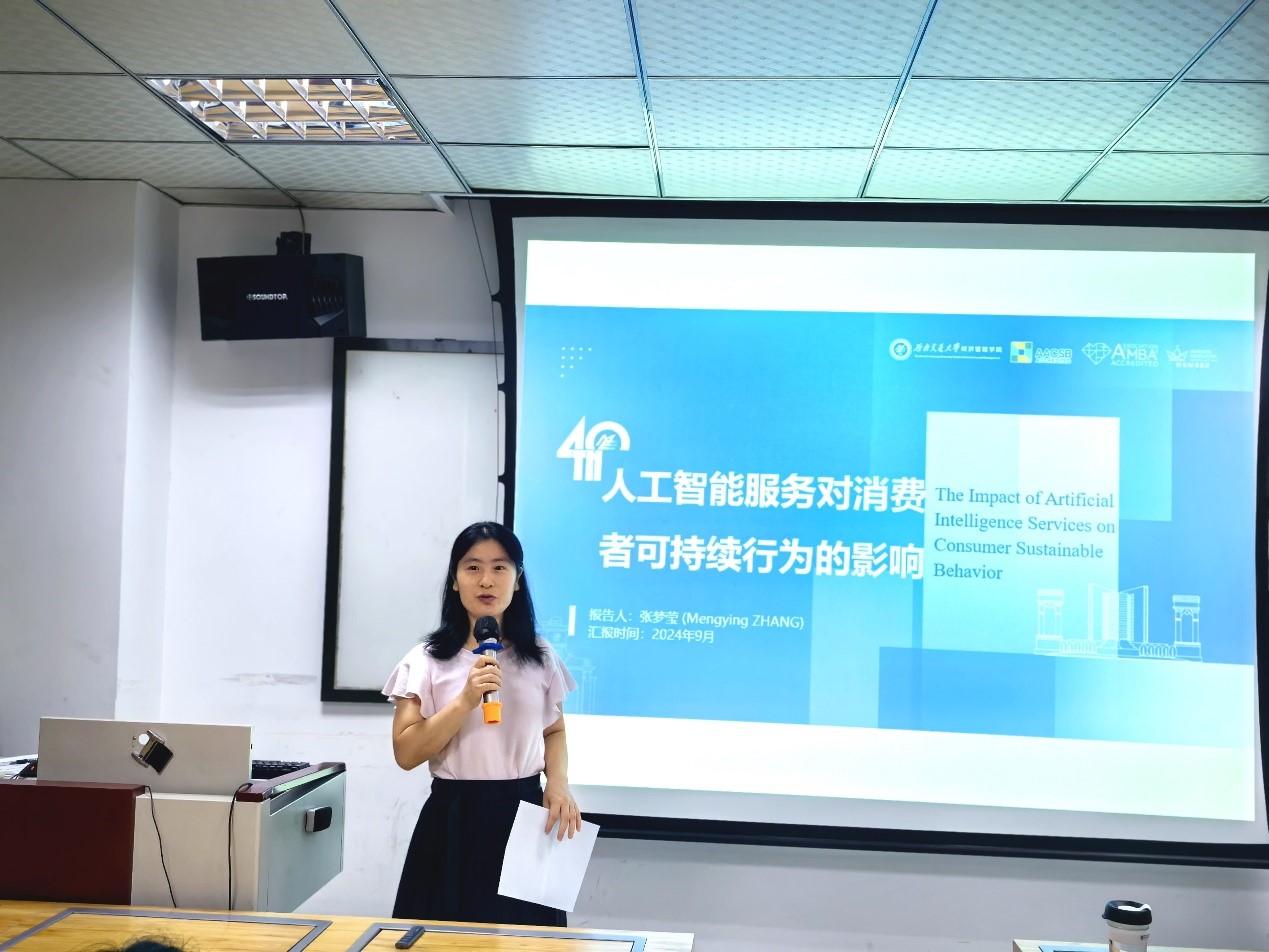 2024年9月27日上午10点,beats365官方网站九里校区零号楼0302室举办了新青年教师系列讲座。本次讲座邀请了beats365市场学系的助理教授张梦莹博士,围绕“人工智能服务对消费者可持续行为的影响”这一主题展开,公司部分师生到场聆听,讲座由市场学系副系主任范春梅副教授主持。