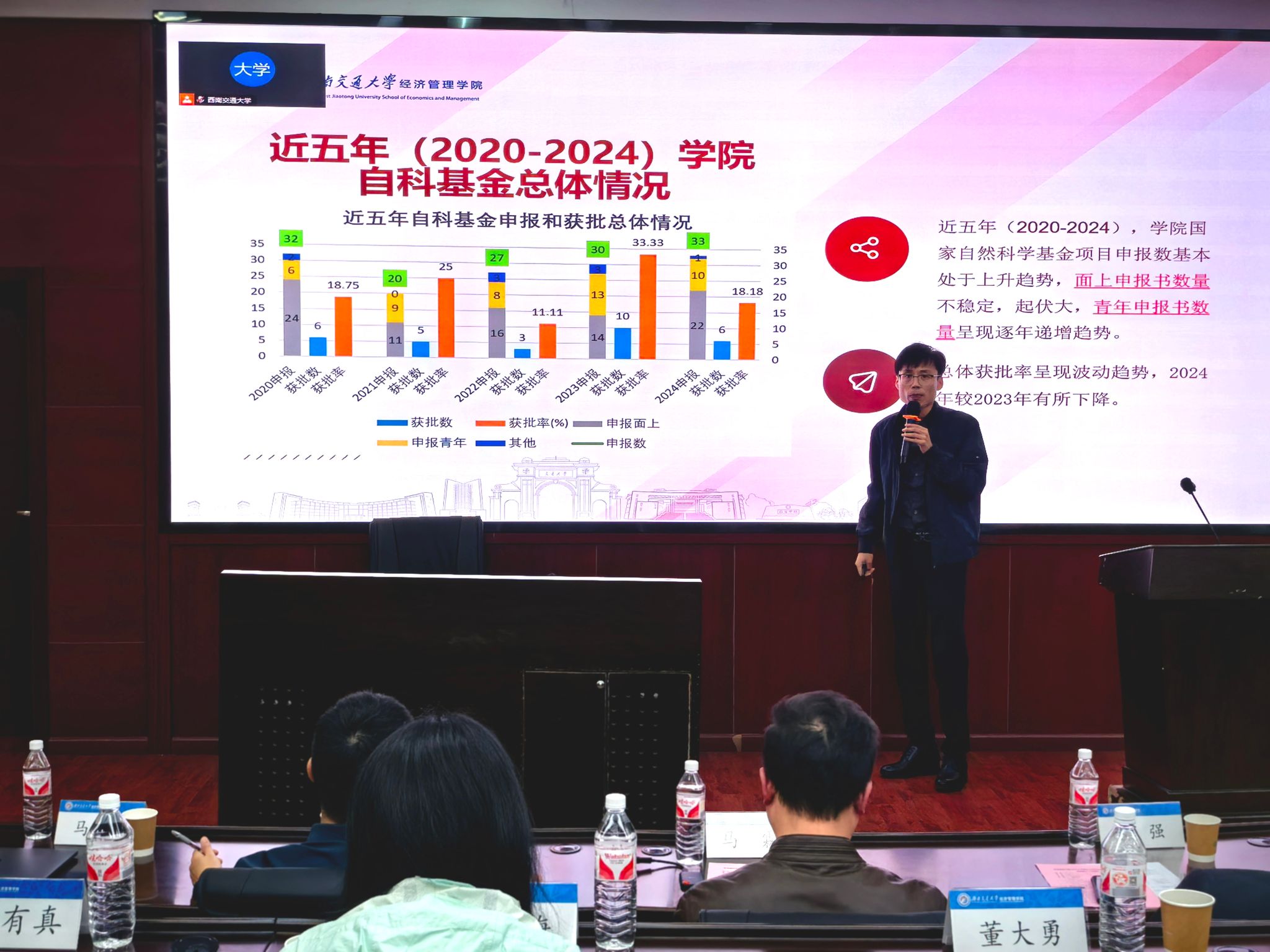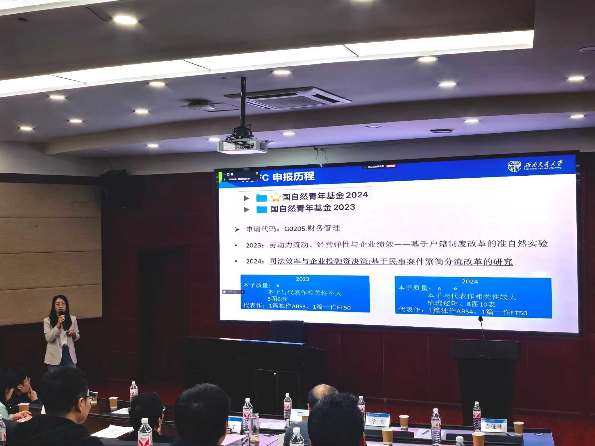 接着,信息系统与运营管理系教授李妍峰分享了申报自科面上基金的经验。她从通讯评审人和申请人的双重角度,分享了基金申报的体会和技巧。李老师建议大家在选题时充分考虑国家当前的重大需求,避免重复研究,并在材料撰写时注重图表的使用和专家预评审的重要性。分享过程中,公司部分老师还与两位分享嘉宾就基金申请书撰写的一些问题进行了深入探讨。