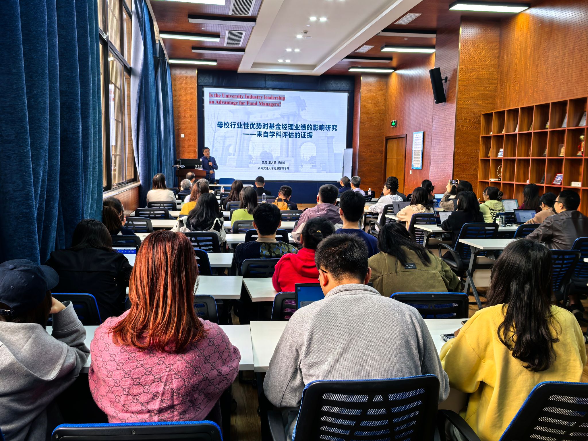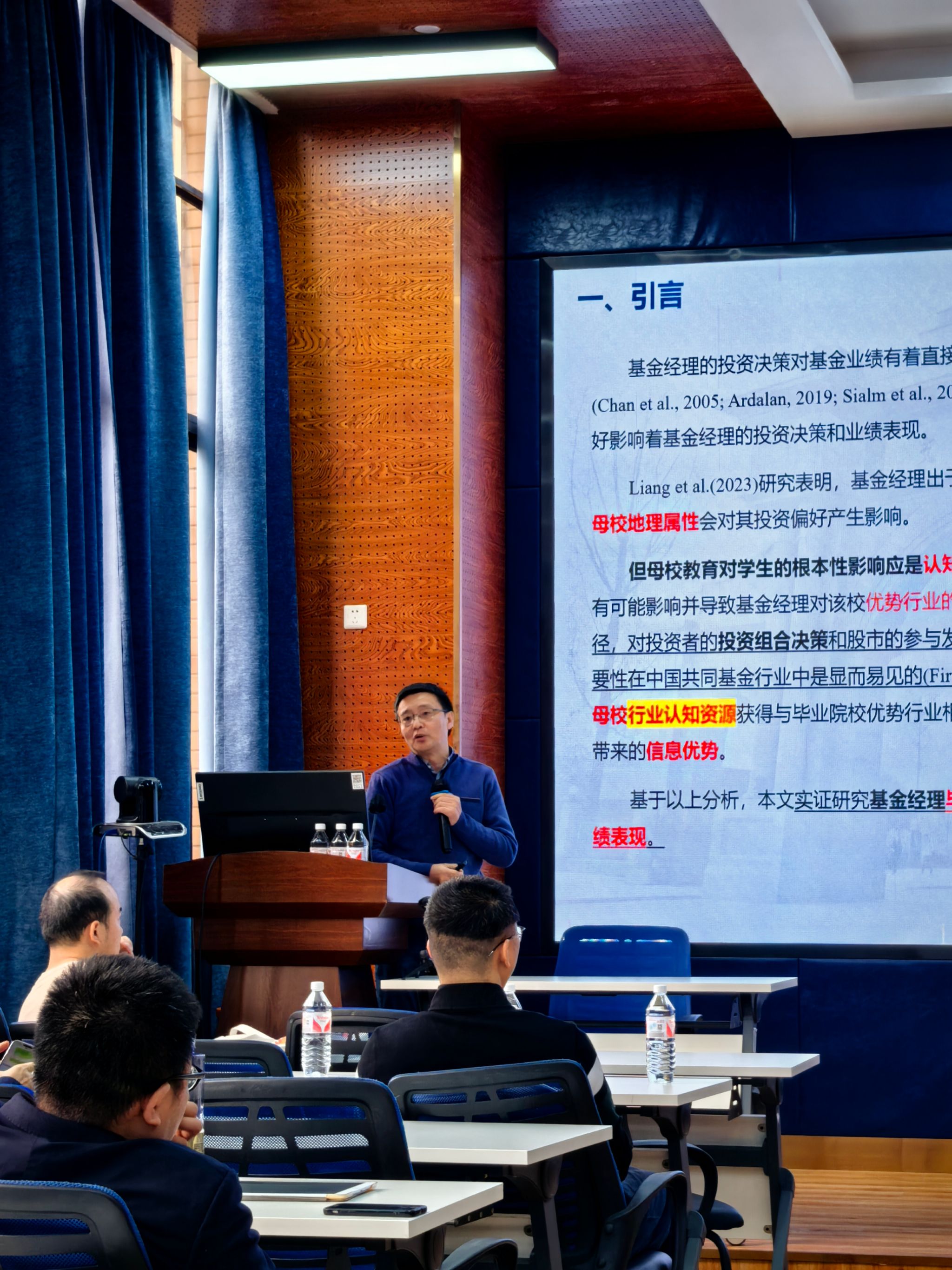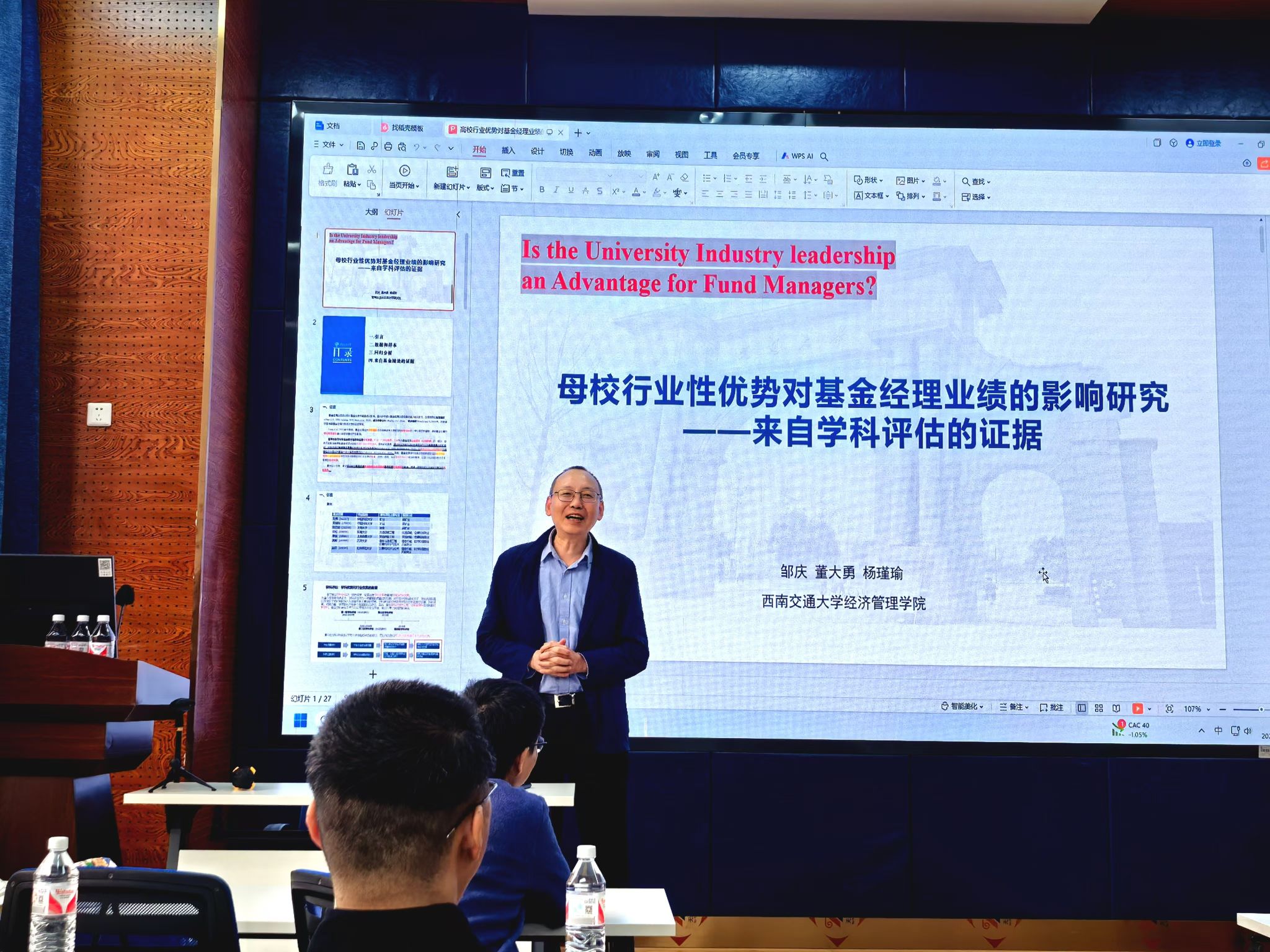 2024年11月1日,beats365官方网站九里校区零号楼0218室举办了师道永传,匠心筑梦——资深教师系列讲座。本次讲座邀请了beats365金融与财务学系的系主任董大勇教授,围绕“母校行业性优势对基金经理业绩的影响研究——来自学科评估的证据”这一主题展开,公司部分师生到场聆听,讲座由beats365副经理李良主持。