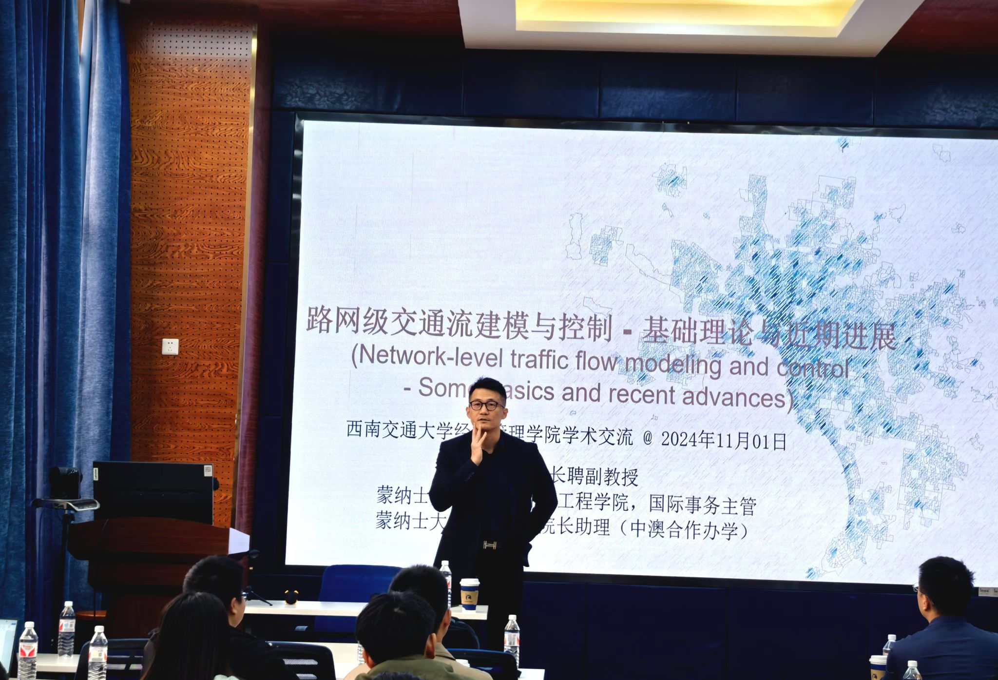 2024年11月1日上午,特邀国际知名的交通流研究专家、莫纳什大学副教授郑楠应邀在beats365为师生带来了一场主题为“网络级交通流建模与控制-宏观基本图模型特性与相关研究进展”的校外学者系列讲座。本次学术活动由beats365经理韩科主持,beats365及交通运输与物流公司相关专家、老师、研究生共80余人参与此次学术交流活动。公司经理韩科对郑楠副教授的学术背景与成就进行了介绍,并代表公司对郑楠副教授表示欢迎与诚挚的感谢。
