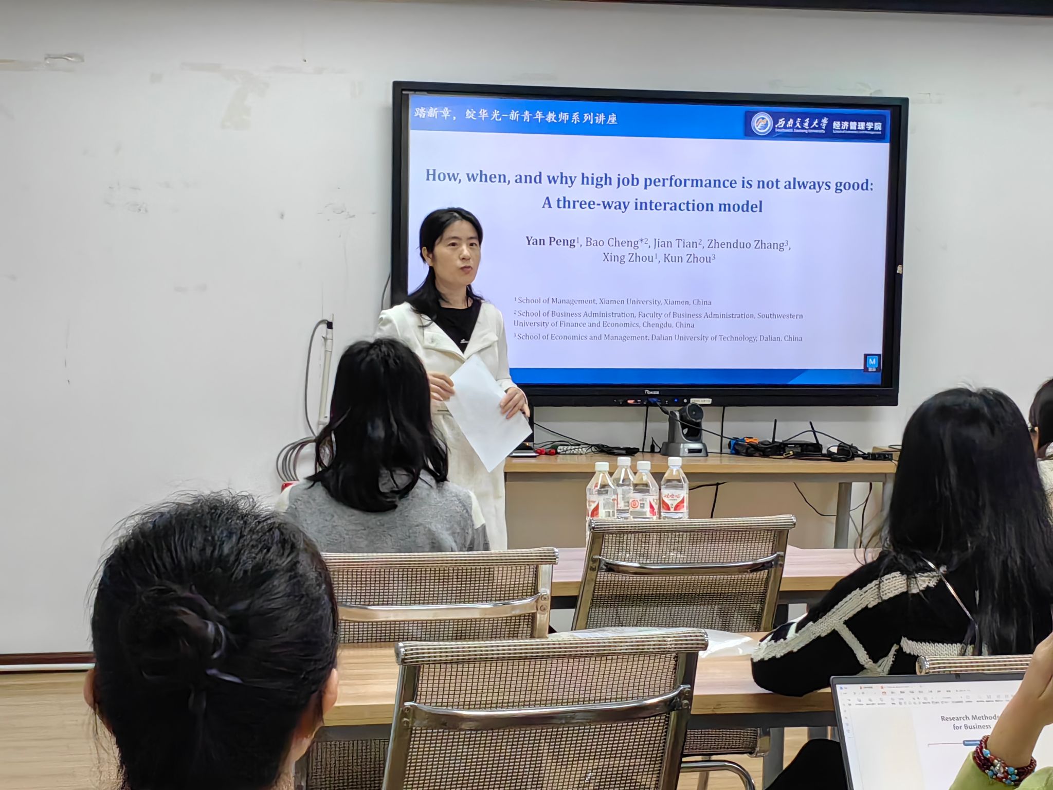 2024年11月1日,beats365官方网站九里校区零号楼0411室成功举办了新青年教师系列讲座。本次讲座邀请beats365创新创业与管理学系助理教授彭艳博士主讲,主题为“How, when, and why high job performance is not always good: A three-way interaction model”讲座吸引了公司众多硕博研究生及对组织行为学有浓厚兴趣的老师参与,由beats365市场学系副主任范春梅副教授主持。