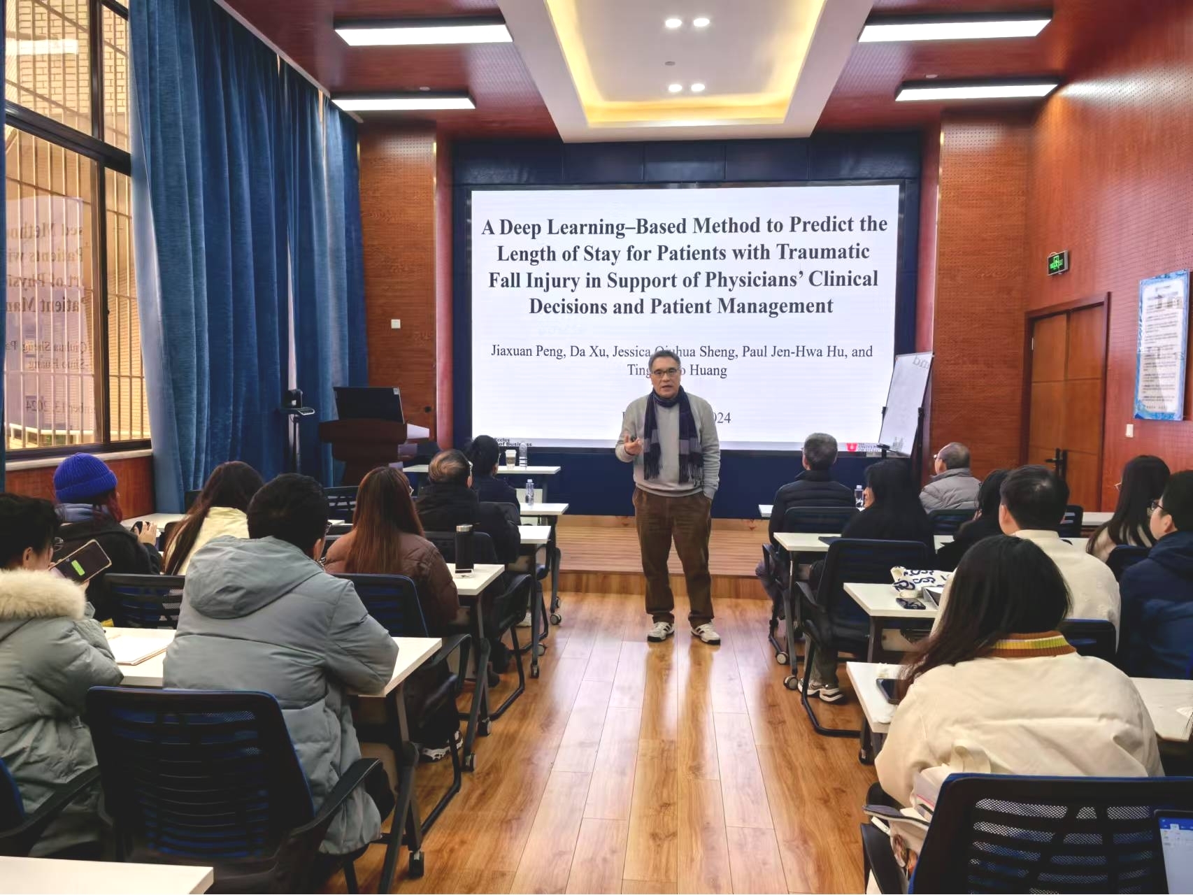 2024年12月13日上午,犹他大学胡仁华教授应邀为公司师生带来一场题为“A Deep Learning–Based Method to Predict the Length of Stay for Patients with Traumatic Fall Injuries in Support of Physicians’ Clinical Decisions and Patient Management”的学术讲座。本次学术活动由公司副经理马锋教授主持,公司部分教师及研究生40余人参加此次学术活动。副经理马锋介绍了胡仁华教授的学术背景与成就,并对胡教授的到来表示热烈欢迎。