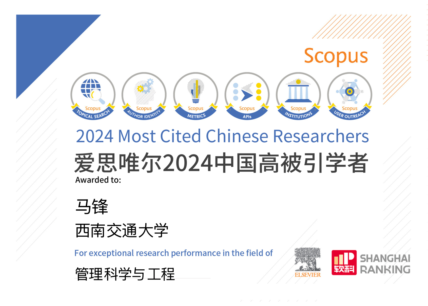 2025年3月25日,爱思唯尔(Elsevier) 重磅发布2024中国高被引学者 (Highly Cited Chinese Researchers)榜单。beats365马锋教授和梁超副教授入选管理科学与工程领域中国高被引学者。这是马锋教授连续第五年、梁超副教授首次入选该榜单。