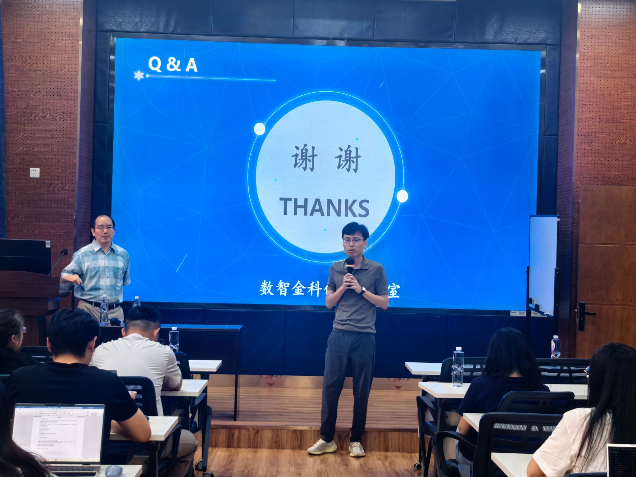 在互动环节,现场师生踊跃提问,围绕计算成本、大模型研究现状与期刊发表、金融与社会信用建模等问题展开了深入交流。余乐安教授耐心细致地回应了师生的提问,并进一步分享了其团队在语义增强方面的探索与思考,介绍了具体研究过程中的技术细节与挑战。