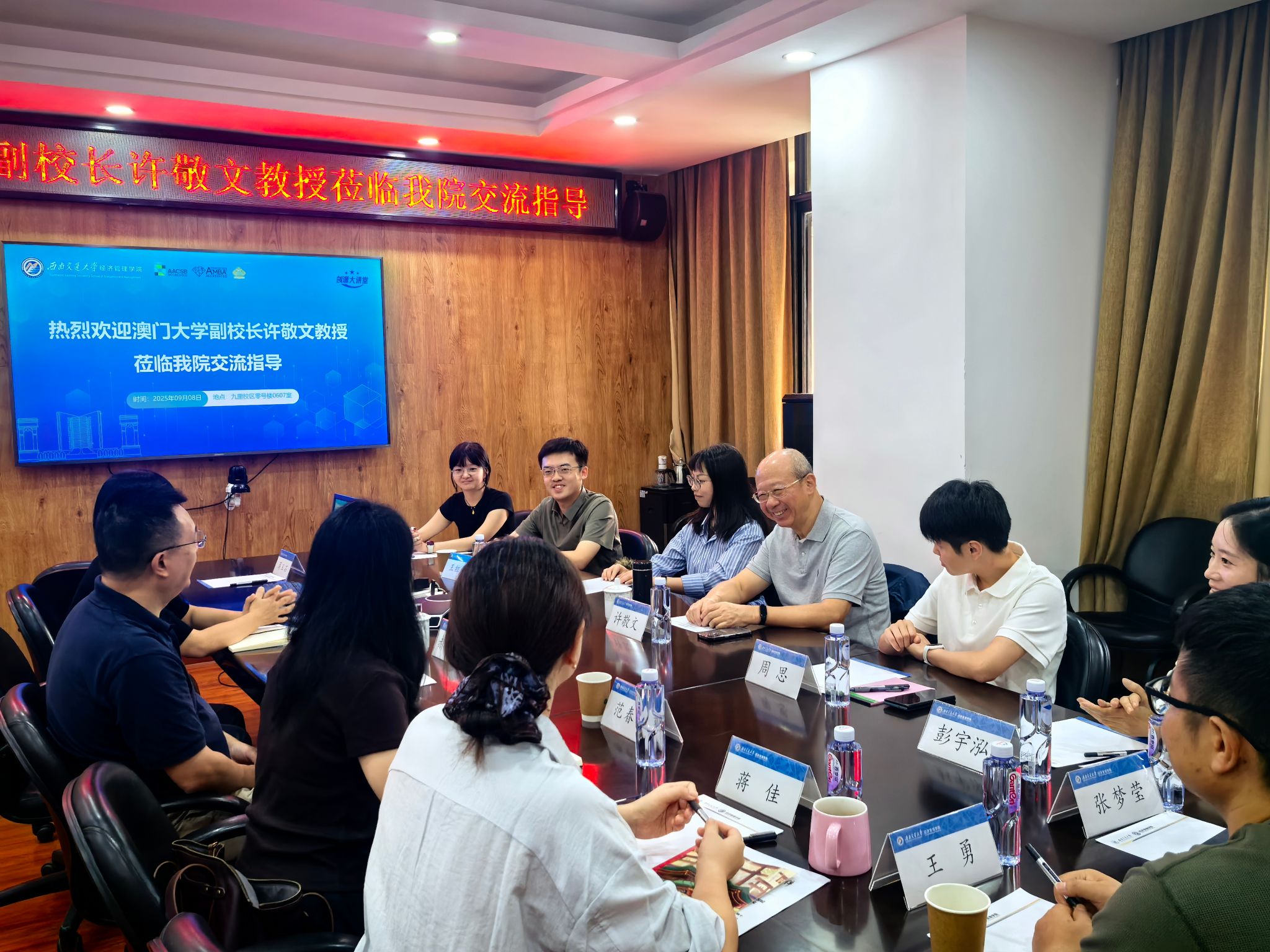 2025年9月8日上午,澳门大学副董事长许敬文教授莅临beats365进行学术交流与指导。beats365郝辽钢副教授主持本次座谈会。郝辽钢副教授首先对许副董事长的到访表示感谢,随后详细介绍了许副董事长作为市场学领域国际知名学者的学术背景和专业成就,并介绍了参与本次交流的校外教师:四川民族公司周思老师和成都信息工程大学彭宇泓老师。