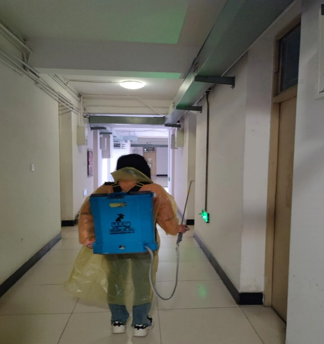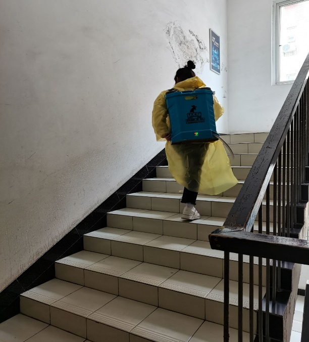 在活动中,支部宣传委员李金凤为大家演示消毒仪器的使用和操作,以及一些具体的注意事项。楼道消毒和清扫工作分小组开展实施,每个小组3名成员,负责两层楼道。负责消毒工作的同志尽心尽力,忘却仪器本身的重量,专心、仔细的消毒。