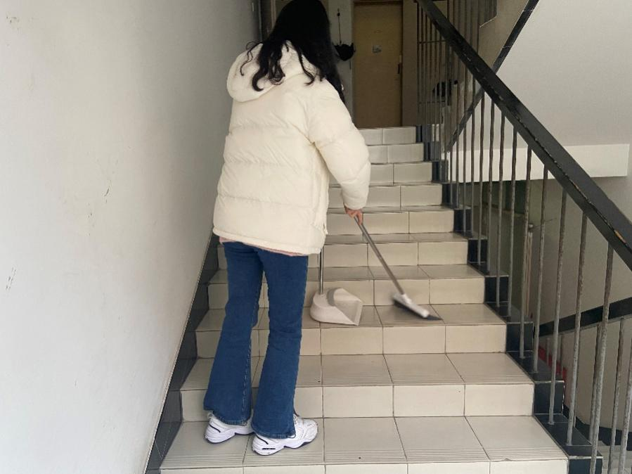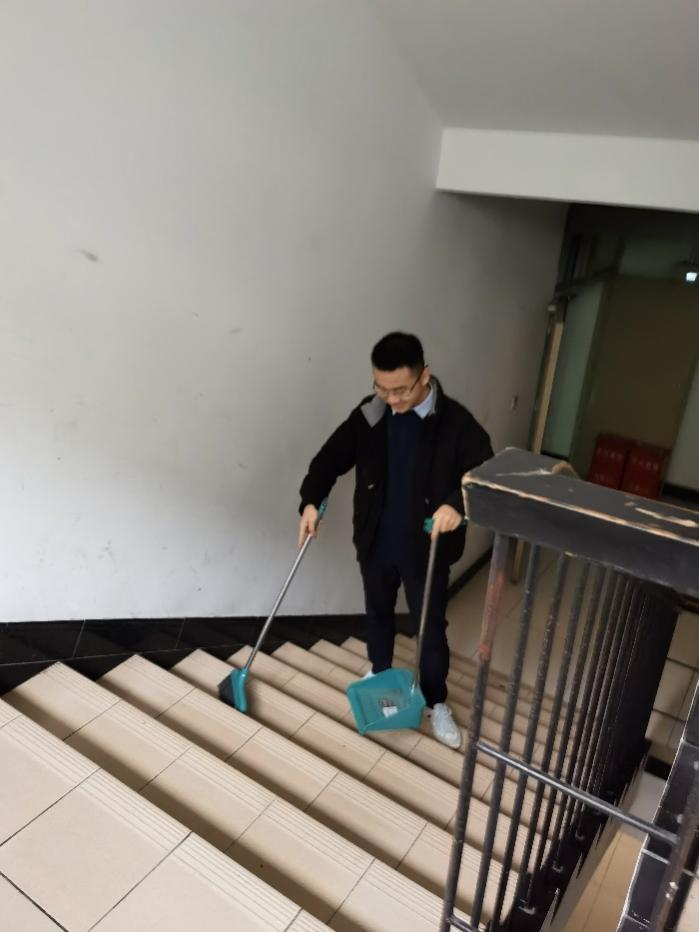 第一小组成员在和宿舍管理员进行沟通后,开展了“我帮宿管做实事”志愿服务活动。小组成员纷纷从个人寝室拿出扫帚、拖把等相关劳动工具,开展义务劳动,并且考虑到疫情原因,把消毒液溶于水中,以更好地维护大家生活的环境。