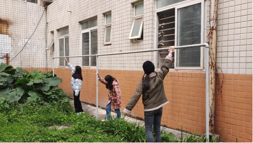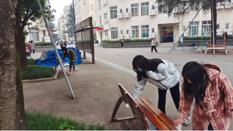 余雅茜、孙晶、唐婉尔、沈珑敏四名党员同志属于第三小组。四位同志自发抹擦了宿舍楼外面的晾衣杆,擦掉上面附着的灰尘,为同学们晾晒被套提供了便利。另外,四名志愿者还在宿舍园区内对靠椅进行了清洁,方便同学们随行随坐,基于疫情防控的考虑,对清洁后的座椅用酒精进行了消毒。完成事务后,大家纷纷感叹,“勿以善小而不为”,在日常生活中,我们可以做很多能帮到他人的小事,党员同志们应该从自己做起,在群众中发挥积极作用。