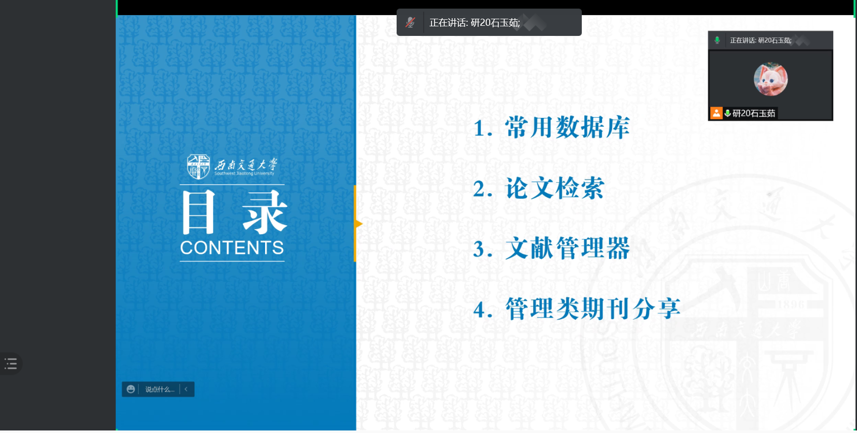 然后,由硕士2020级党支部的石玉茹同志对如何进行文献检索进行了详细的介绍,同时还给同志们分享了常用的数据库以及文献管理器。除此之外,还对一些管理类的优秀期刊进行了介绍。在听过石玉茹同志仔细的介绍之后,进入问答环节,本科生同志们就写论文过程中会遇到的问题进行了踊跃的提问,同时研究生同志们也补充分享了自己在做研究中的一些小技巧。