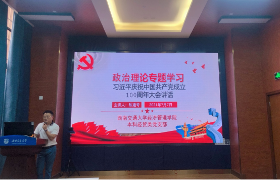 本科经贸类党支部于7月7日在J0218教室举办了学习习近平总书记在庆祝中国共产党成立100周年大会讲话——beats365本科经贸类党支部政治理论专题学习,由党支部书记陈建奇主讲,支部的全体党员及部分积极分子参加了专题学习会议。