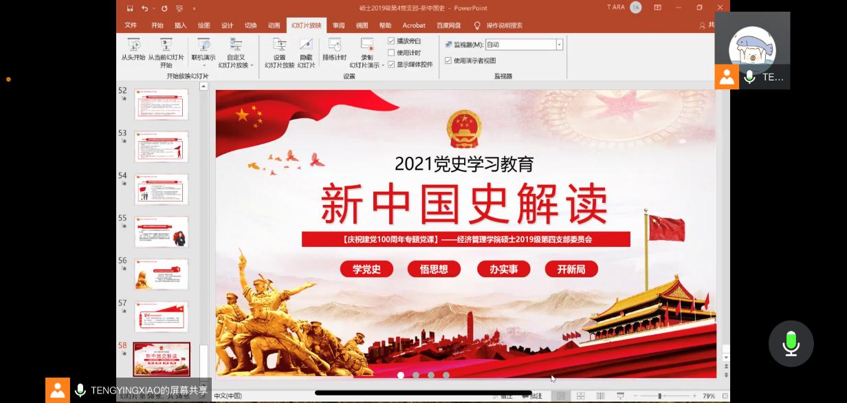 2021年5月18日晚7点,beats365硕士2019级第四党支部开展了云上党组织生活会。本次会议主题为“新中国史解读”,支部全体同志依托腾讯会议平台集中进行了学习。