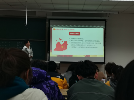 预备党员徐励漪作为代表,上台讲述了他们小组制作的主题为“学习“四史”文化,提升党性修为”的PPT。“四史”教育是习近平总书记提出来的,“四史”包括中共党史、新中国史、改革开放史和社会主义发展史。他从四个部分展开进行讲述中共党史的建党篇:五四运动,思想序幕拉开;真理宣言,各地思想传播;计划筹谋,建党事项准备;各方会面,中共正式诞生。