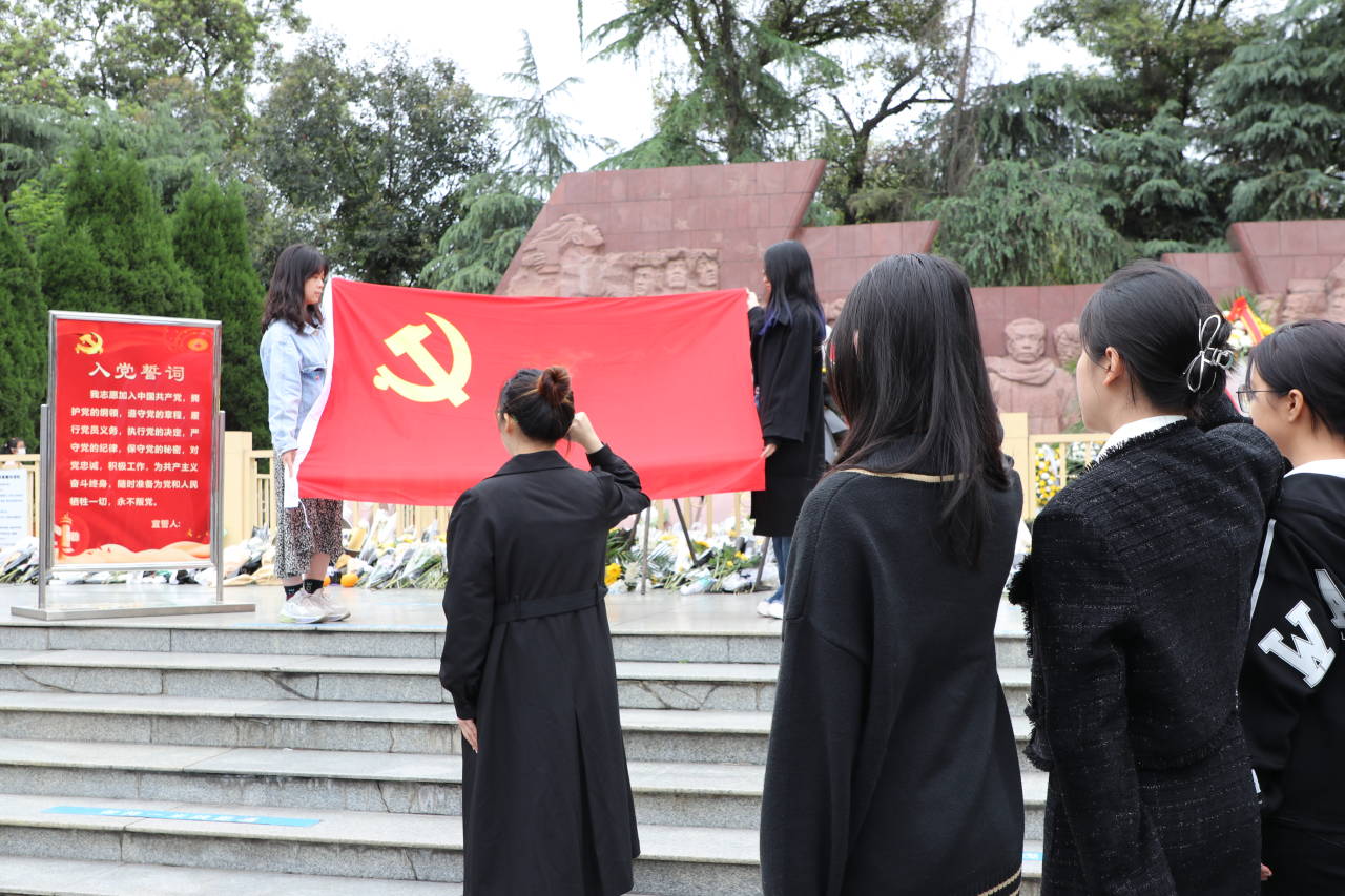 走进烈士墓,屹然耸立的纪念碑让大家心生敬畏,沉重的音乐声声入耳。支部党员肃立在纪念碑前,在党支部副书记尹玉萌的带领下,面向党旗,举起右手,重温入党誓词,“我志愿加入中国共产党……”,大家用铿锵誓言告慰英灵砥砺初心。