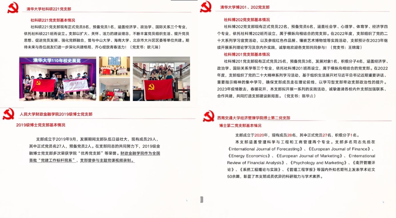 随后各党支部书记围绕着支部人员结构、特色工作案例、支部荣誉等多方面介绍了本支部的基本情况,进一步对标优秀支部,交流支部建设经验。