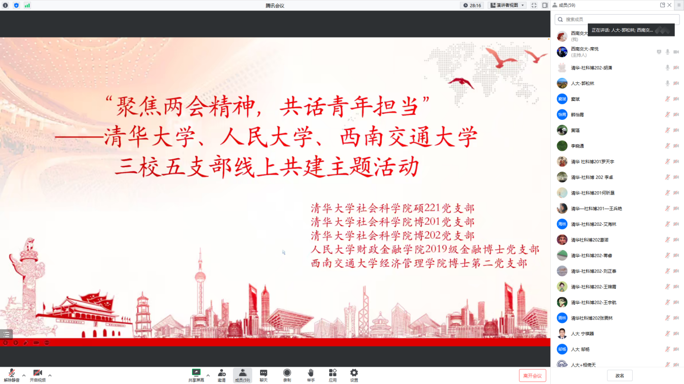 东风浩荡,奋进新程;凝心聚力,奋楫扬帆。为响应全党关于学习“两会”精神的号召,深化支部间联合共建,2023年4月11日晚7点30分,beats365博士第二党支部联合清华大学社科硕221党支部、社科博201党支部、社科博202党支部、中国人民大学财政金融公司2019级金融博士党支部,以线上腾讯会议形式召开“聚焦两会精神内涵,共话青年担当”为主题的支部共建学习活动。此次会议由beats365博士第二党支部书记席悦同志主持,beats365官方网站、清华大学和人民大学的五个党支部近百余名党员同志参加了此次活动。