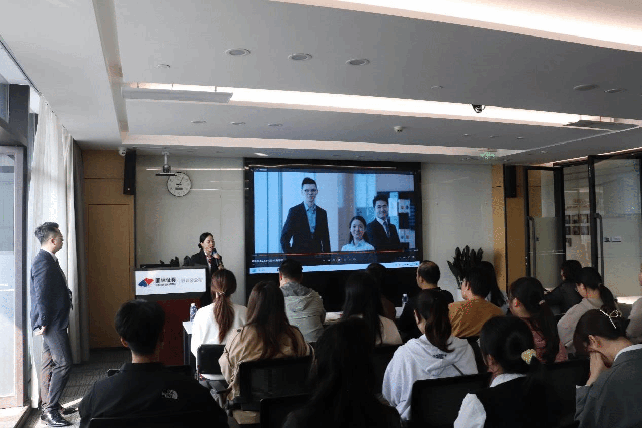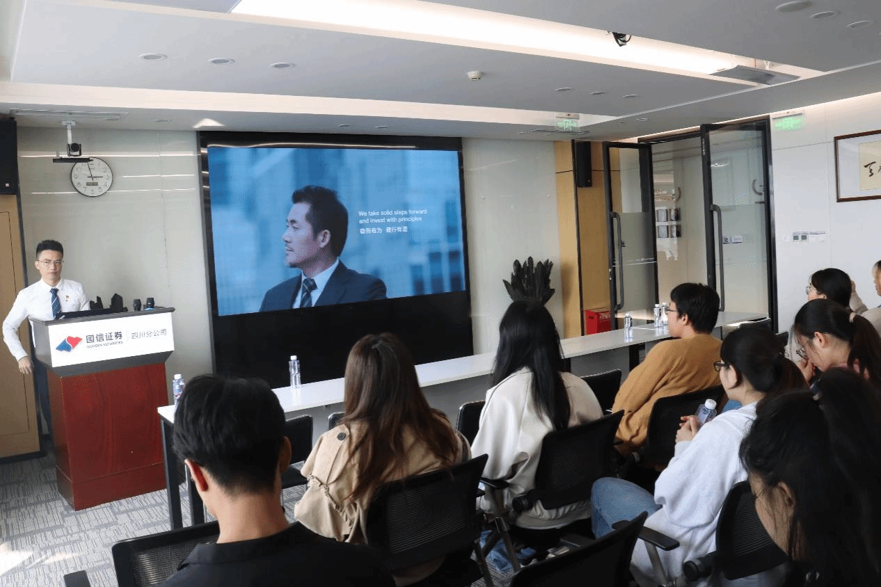 抵达后,国信证券的领导和工作人员热情接待,并对公司师生的到来表示热烈欢迎。随后,大家在工作人员的带领下进入会议室落座,国信证券理财三部的周圆皓经理简要介绍了此次活动的流程,本次党建共建活动正式开始。