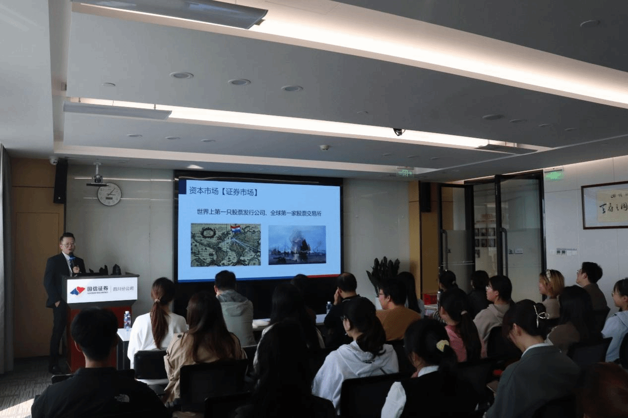 茶歇过后,国信证券针对师生所需分别开设了教师和员工专场进行分享交流。在员工专场,国信证券的陶波经理为同学们介绍了证券行业的特点、就业市场的人才需求等,旨在培养和提高大家的职场意识与能力。在教师专场则举行交流座谈会,国信证券的何启彬总经理向大家更加详细地介绍了企业文化、发展前景、党建内容等,以及对公司相关专业的就业需求。