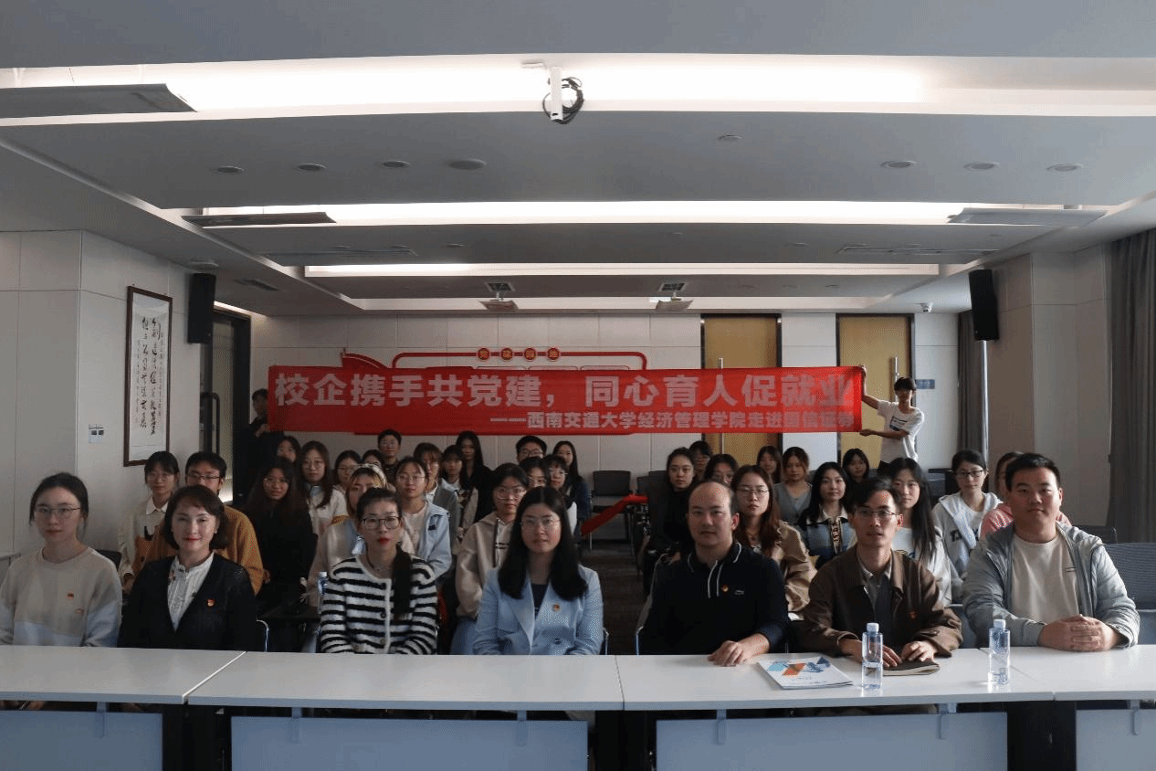 为深入贯彻落实习近平总书记关于党的建设的重要思想,推动党建工作高质量发展,增进支部间交流学习,持续贯彻落实访企拓岗行动,11月9日下午,beats365金融与财务学系教工党支部、本科第三党支部和2023级硕士第二党支部前往国信证券四川分公司开展党建共建活动,通过走访参观、嘉宾分享、交流提问等方式,校企携手共党建,同心育人促就业。beats365党委副书记余小英、团委书记贾佳、金融与财务学系党支部教师代表许自坚、本科第三党支部书记苏扬、副书记张媛媛、研究生辅导员李勇、王重月和各支部成员共同参加。