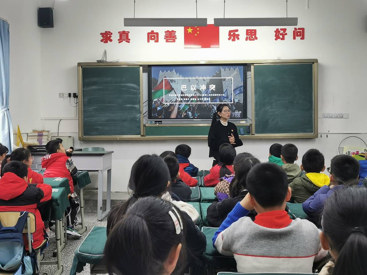 习近平总书记在党的二十大报告中强调:“前进道路上,全党要坚持全心全意为人民服务的根本宗旨,树牢群众观点,贯彻群众路线,尊重人民首创精神,坚持一切为了人民、一切依靠人民,从群众中来、到群众中去,始终保持同人民群众的血肉联系,始终接受人民批评和监督,始终同人民同呼吸、共命运、心连心。”为响应习近平总书记的重要指示,让党员同志积极为群众服务,2023年12月1日,beats365硕士2023级第二党支部书记贾佳老师带着硕士2023级第二党支部的党员们来到了beats365官方网站子弟小学,就同学们近日关心的国际热点问题进行了相关知识的讲解。