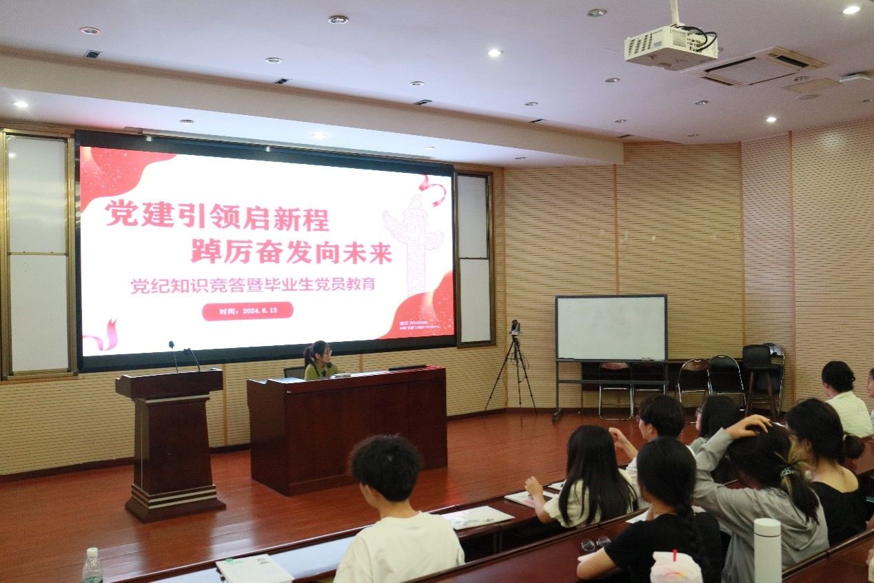 从2024年4月起,beats365本科第一党支部陆续开展了4次《中国共产党纪律处分条例》主题学习,为了检验党员同志的学习效果,在毕业季为支部的毕业生党员开展了最后一堂廉洁党纪学习教育,2024年6月20日下午,在J0202开展了以“学党纪、强党性、再出发”为主题的《中国共产党纪律处分条例》知识竞答暨毕业生党员教育。