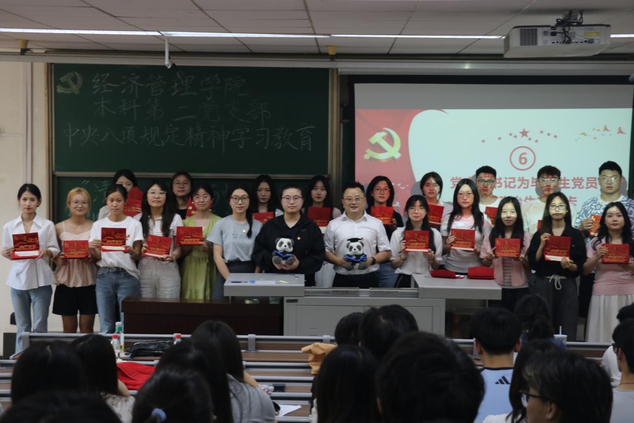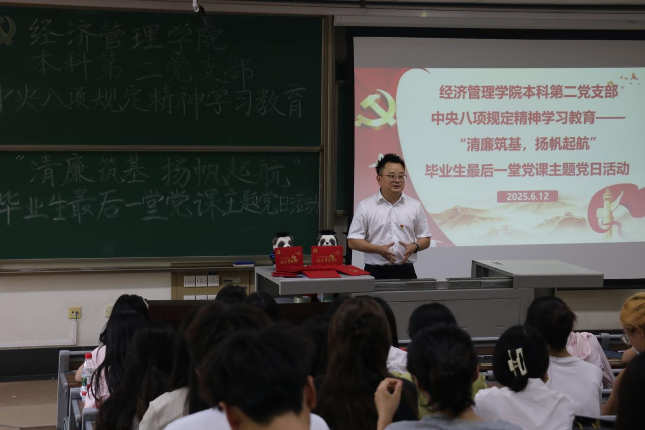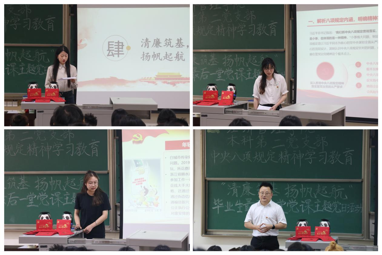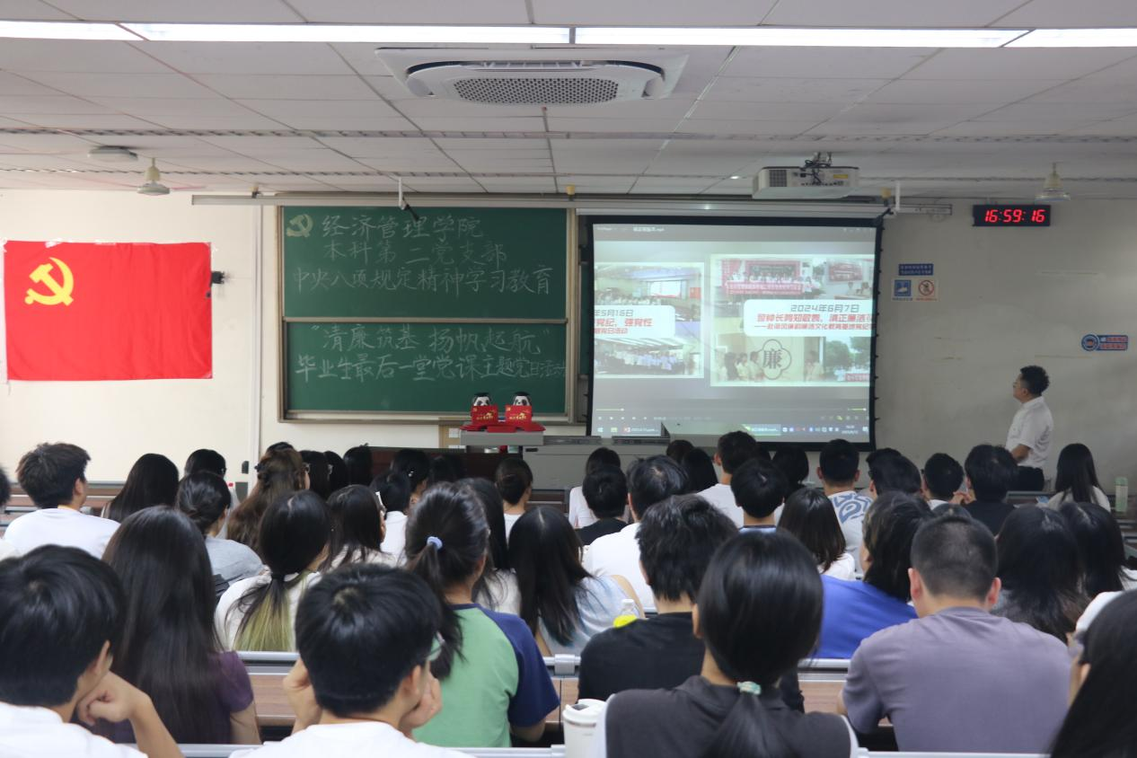 为深入贯彻中央八项规定精神学习教育,强化党员的廉洁自律意识,进一步增强毕业生党员的党性意识和社会责任感,6月12日,beats365本科第二党支部于J4310开展深入贯彻中央八项规定精神学习教育——“清廉筑基、扬帆起航”毕业生最后一堂党课主题党日活动。