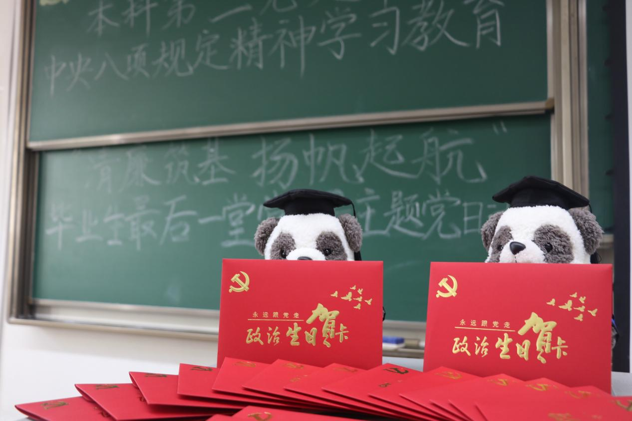 最后,党支部书记陈建奇、副书记时梦、青年委员游婷为毕业生党员颁发入党生日贺卡,精美的贺卡上写满了对毕业生党员的祝愿与嘱托。希望2021级毕业生党员始终铭记入党时的赤诚初心,在纷繁复杂的现实考验中永葆政治本色。